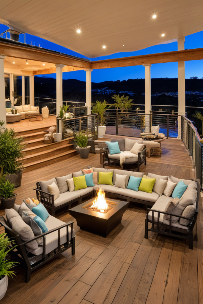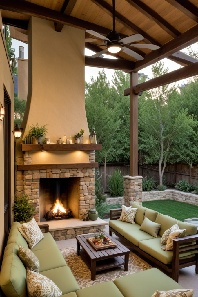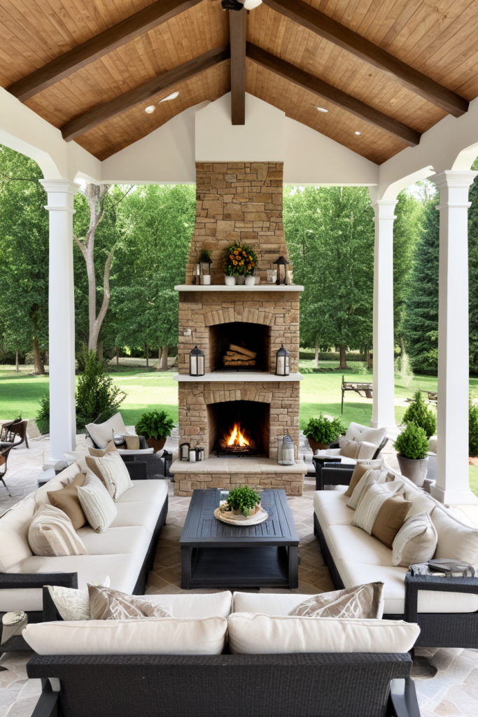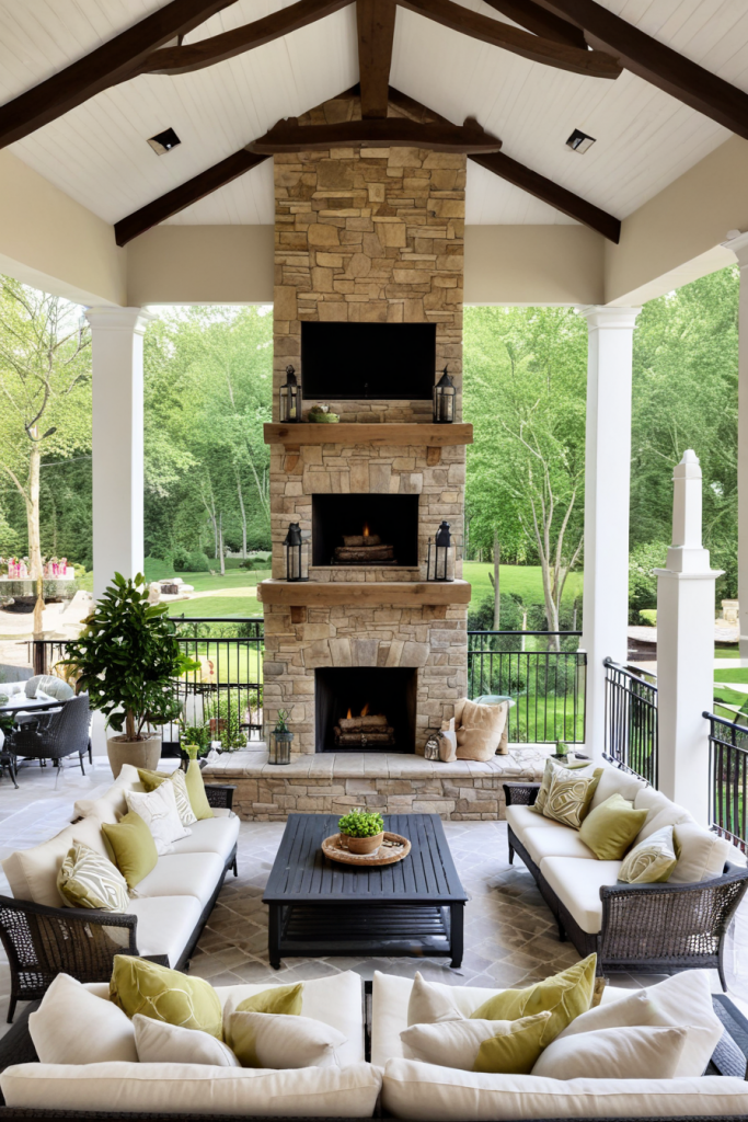 A social veranda is a valuable asset for entertaining guests. A sectional sofa, bar carts, and a fireplace are perfect for sparking conversation and relaxation which make gatherings more enjoyable. Speakers along with appropriate lights make hosting smoother. Together with stools and lounge chairs, the space becomes very versatile for large and small gatherings.