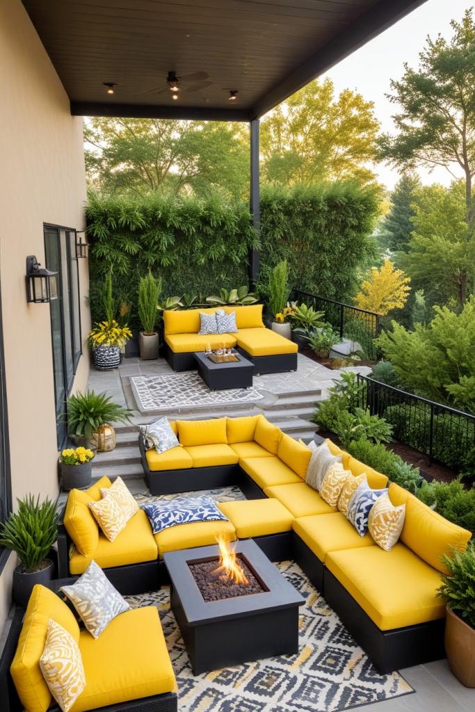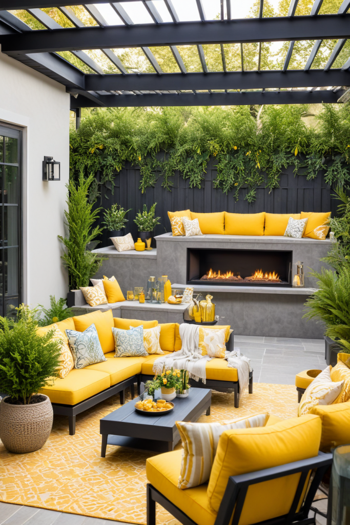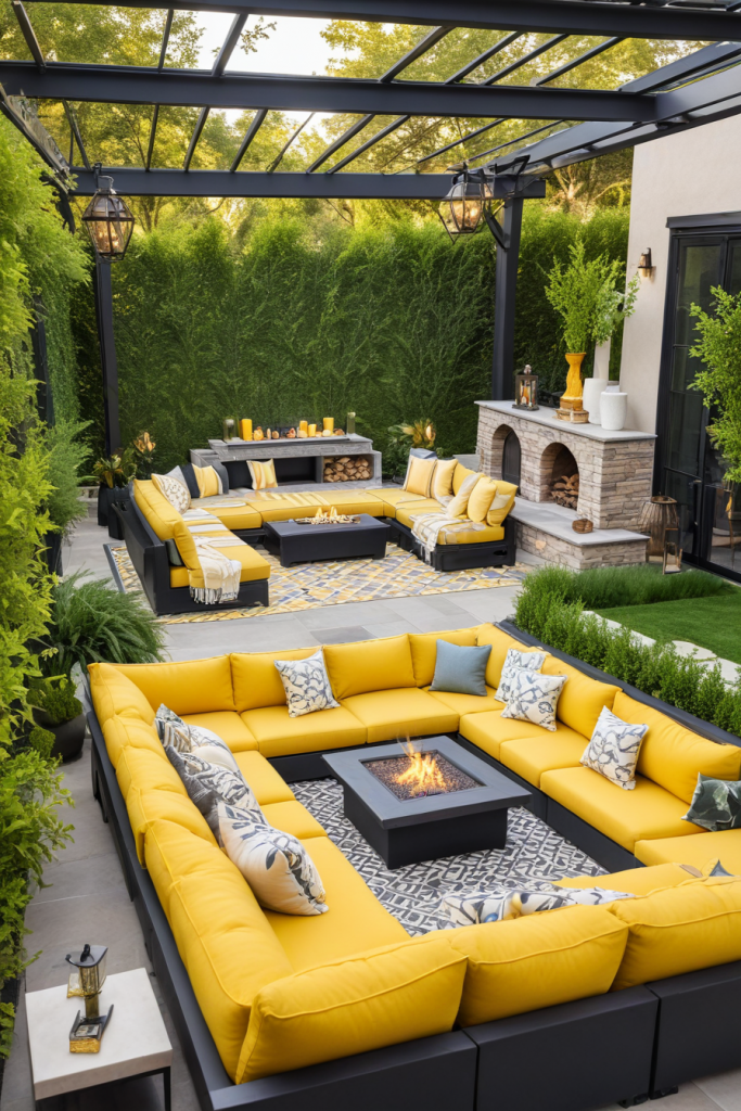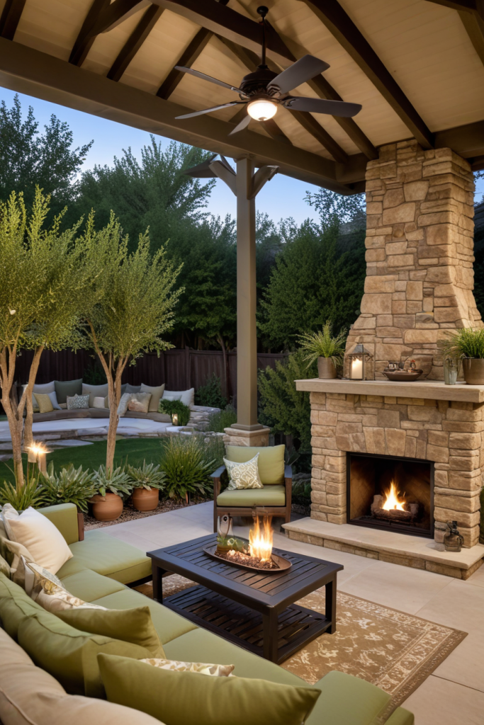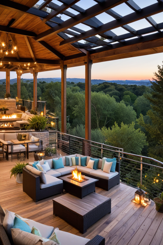 A social veranda is a valuable asset for entertaining guests. A sectional sofa, bar carts, and a fireplace are perfect for sparking conversation and relaxation which make gatherings more enjoyable. Speakers along with appropriate lights make hosting smoother. Together with stools and lounge chairs, the space becomes very versatile for large and small gatherings.