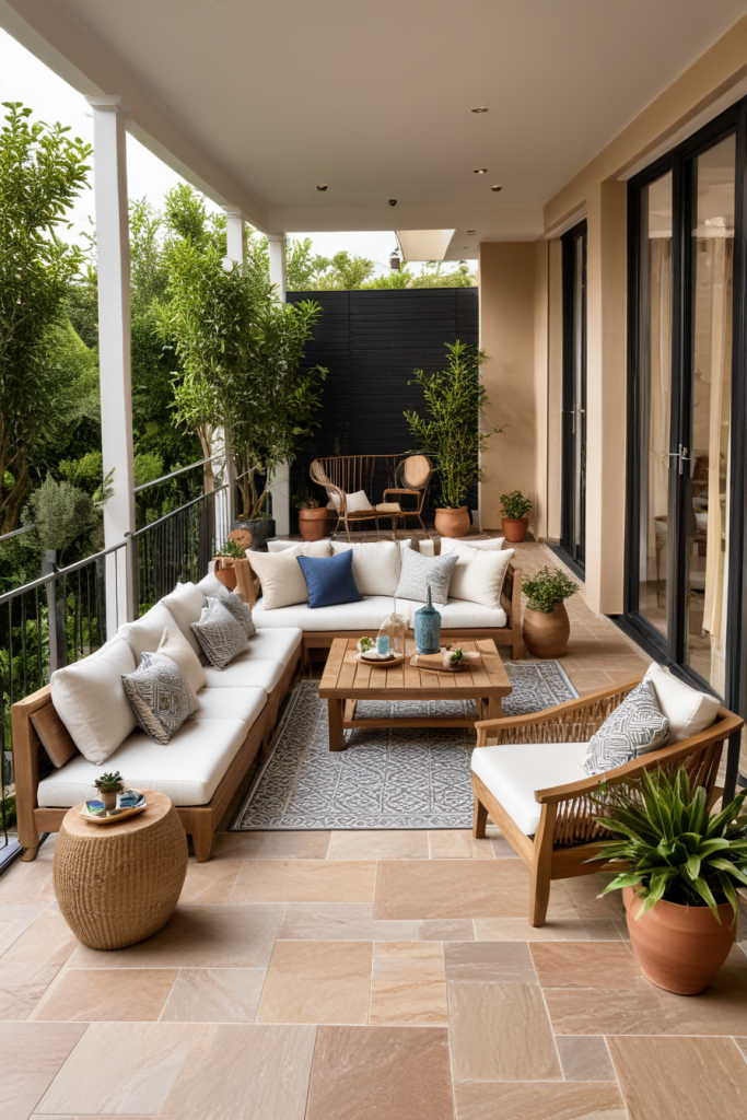 Contemporary verandas forego overly decorative design elements in favor of clean and minimalist furnishings. Imagine glass railings, neutral modular seating with plush cushions, and LED strip lighting. Combined geometric patterns on textiles enahnce the overall sophistication of the setting.
