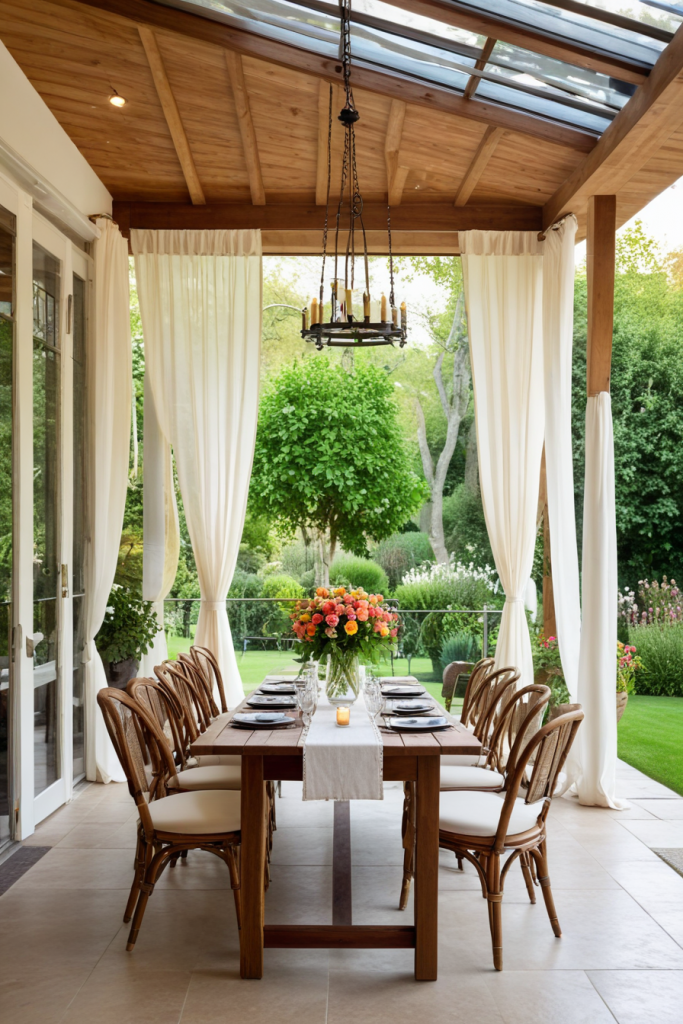 The combination of saavy style and comfort is evident in a veranda’s dining space which makes every meal memorable. An inviting dining area is created with a stylish chair set along with the solid wood or metal dining table. The addition of a floral centerpiece, a candle set, and weather-resistant tableware further enhance the beauty alongside a statement chandelier. Beautiful but functional sheer curtains or retractable shades provide the perfect finishing touch.