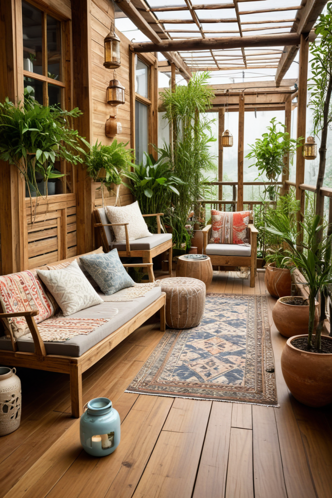 Using eco-friendly materials on the veranda floors helps to achieve aesthetic appeal while also practicing eco-sustainability. First, consider tangible items such as reclaimed wood, bamboo, or even composite materials. These offer sufficient style while being environmentally friendly. Also consider using furniture made out of recycled materials. Natural fabrics such as organic cotton or jute can also be made into rugs, which can conceal and add style to the floor. For aid in achieving green vertically, vertical gardens or even potted plants can be added which further improves air quality and aesthetics.