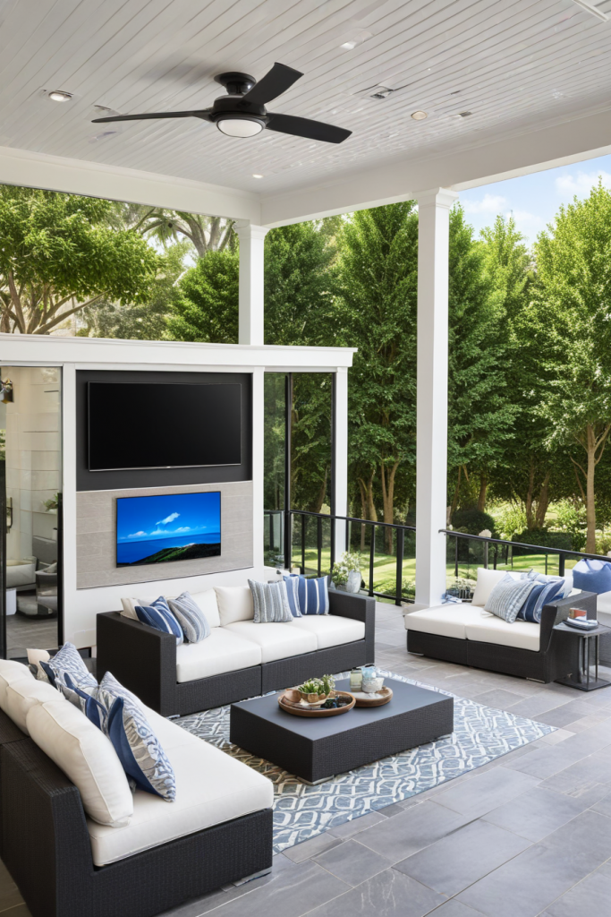 Embracing technology in the veranda increases comfort and level of ease of the users. Automated lights, voice-activated outdoor speakers, and smart ceiling fans make the space more functional. Motion sensor lights and Wi-Fi security cameras increase safety, and temperature is regulated by control retractable smart shades. Weatherproof projectors or smart TVs turn the veranda into an entertainment center.