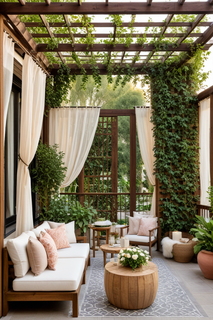Constructing a private veranda getaway guarantees relief and privacy. Set up ornamental privacy screens, semi-transparent curtains, or bamboo shades to allow fresh air in while blocking out unwanted sights. Vivid greenery like towering potted plants or a vertical garden serve as an added natural barrier. Cozy pergolas or wooden lattice walls adorned with climbing plants block out sunlight and serves as a form of privacy screening. This creates a warm and intimate atmosphere outdoors.