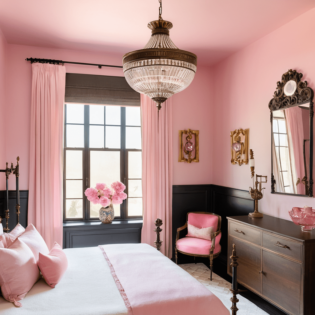 A room decorated with vintage furniture is mostly painted in soft pink with the purpose of creating a soft, feminine, and subtle ambiance simultaneously. Along with the pink color of the wall, classic furniture items like a tufted velvet headboard or an antique vanity can be perfectly paired. Do not forget that such a choice of color and design will make the room airy and softer. To add your personal touch and to express your love of pink hues, put on the walls floral prints, use laces, and use pastel-colored accessories.