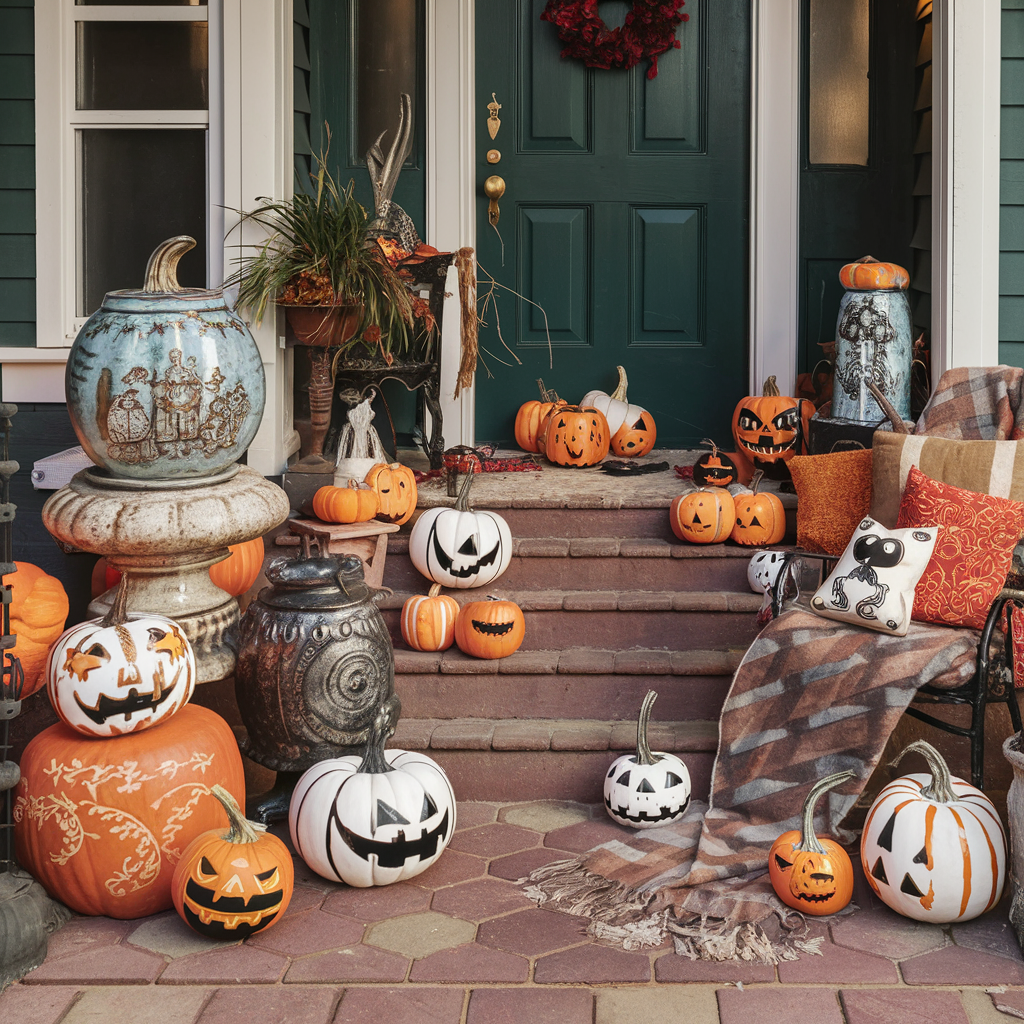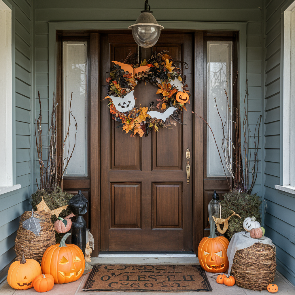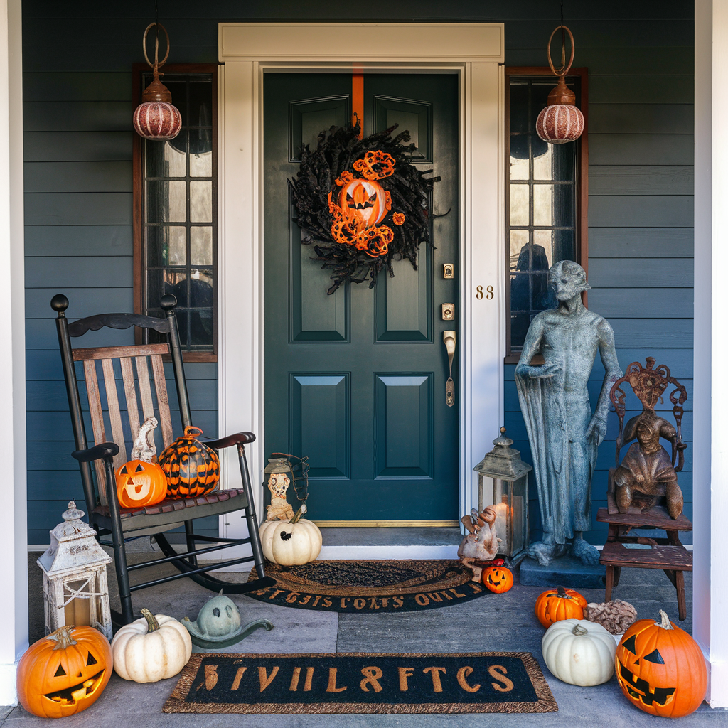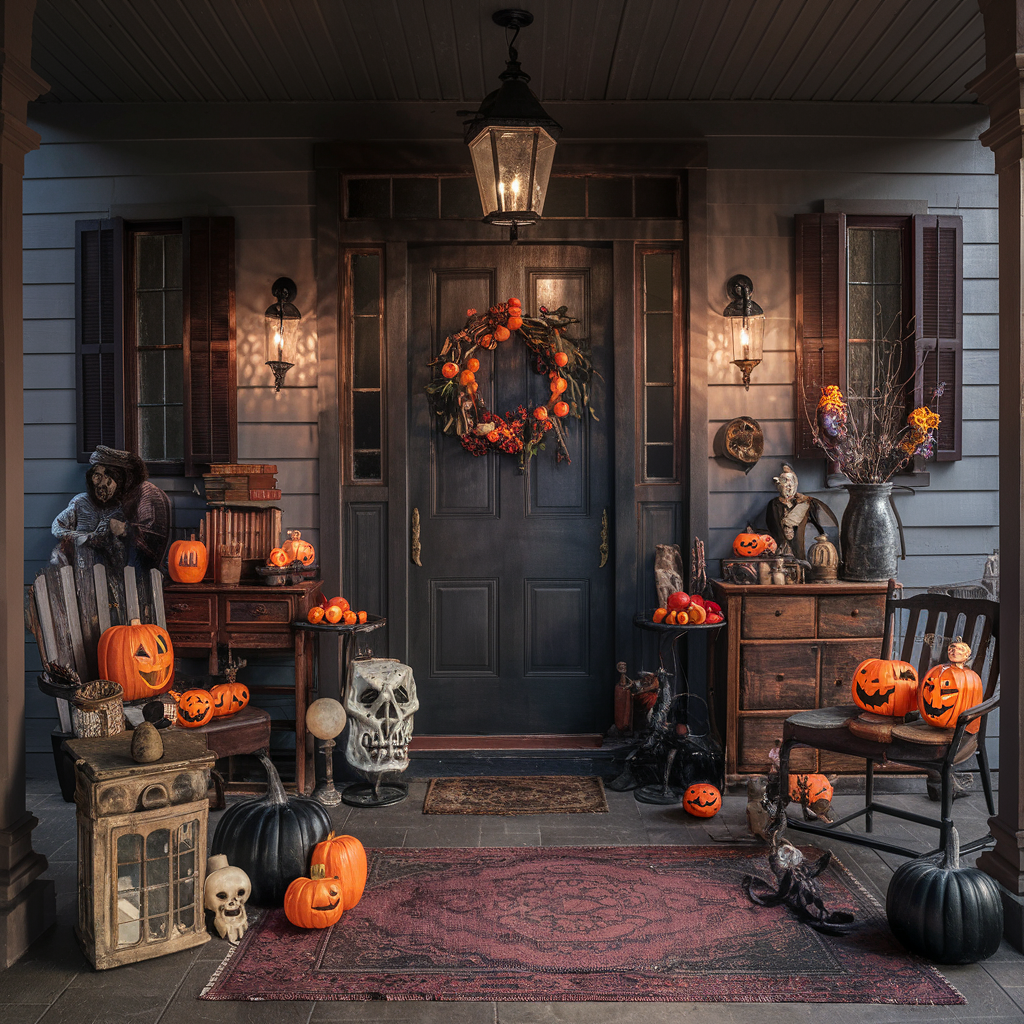Your front porch is the first thing guests see, which makes it a perfect decor feature to exhibit your vintage Halloween ideas. Choose thrifted things such as old rocking chairs, vintage lanterns, and sculptures to give a comfortable yet ominous reception to visitors. Along with that, introduce some vintage spirit with the Halloween wreath on the door, and fun items like pumpkins carved out or little antique toys placed all around the porch. This setup sets the pitch for your other Halloween decorations and also gives the first impression of your home that visitors will never forget.