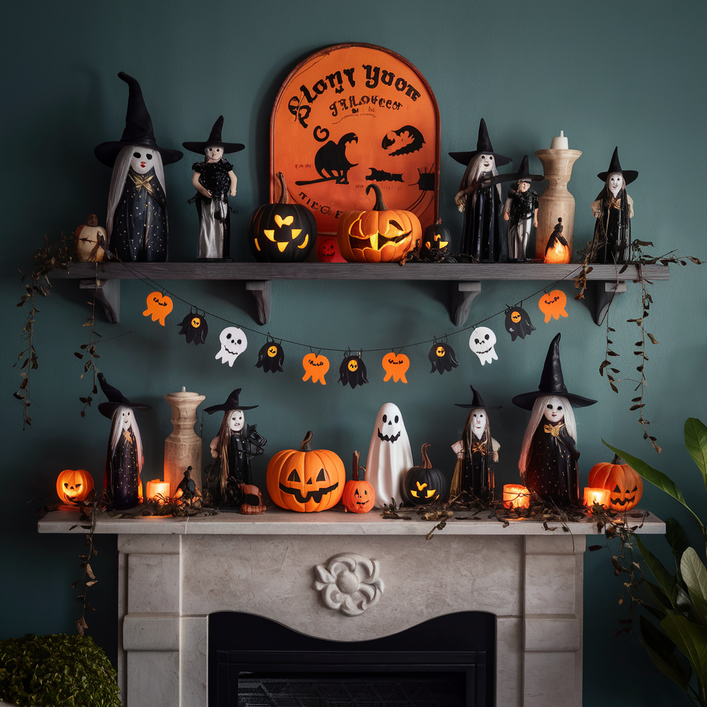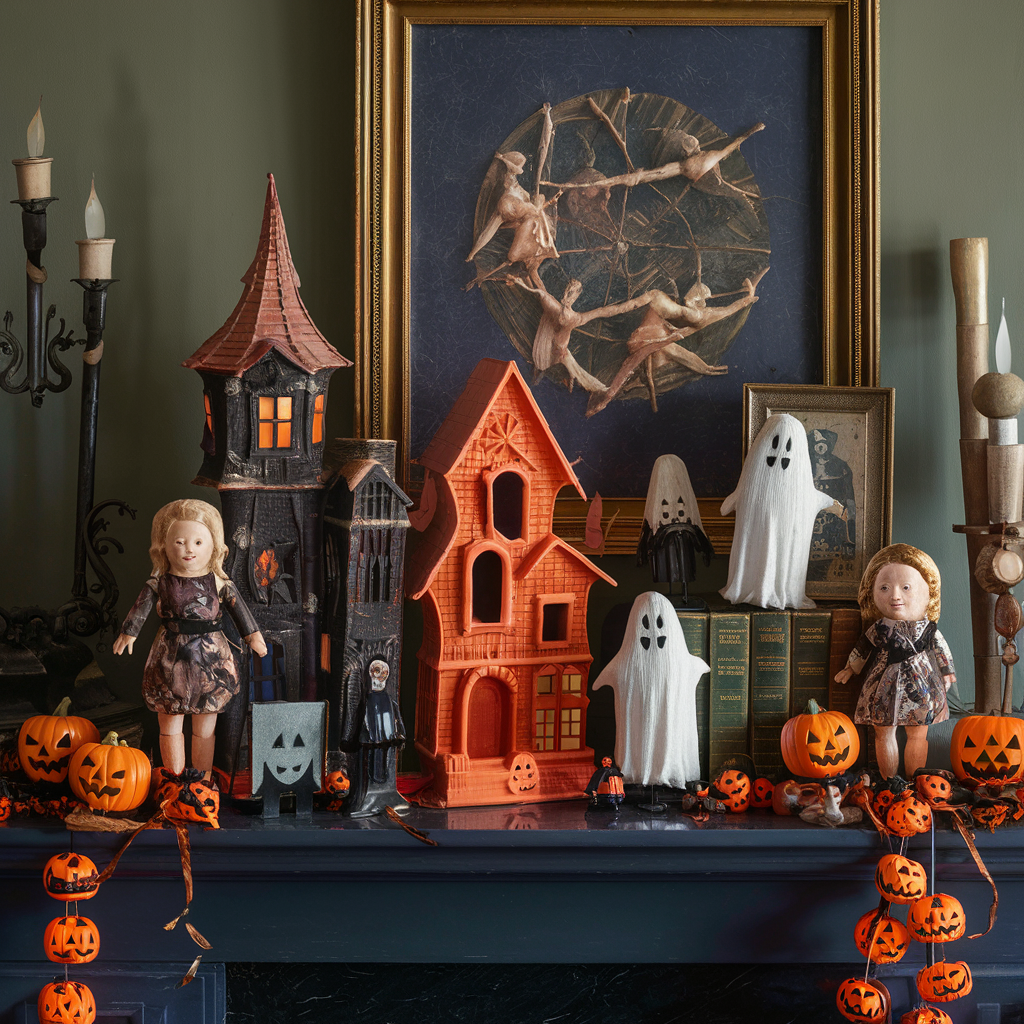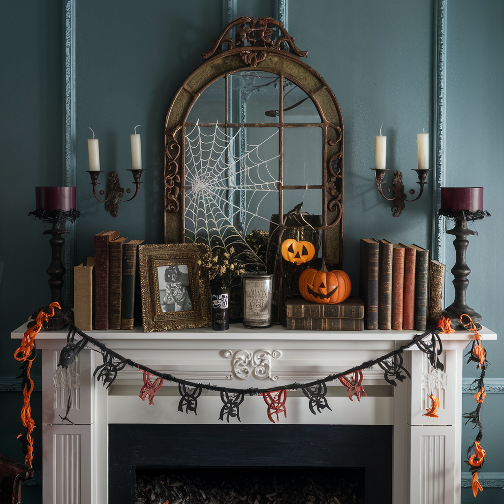 The mantel is the most important interior architectural feature in a room that often becomes the focus of attention, so it is a good idea to display the vintage Halloween decorations there. Try a DIY project with thrifted items like old picture frames, books, and candle holders. Put some elegance by a mirror decorated with spiderwebs or a little DIY Halloween banner. Moreover, this setting not just conveys the beauty of the past but also becomes the center of attention for your Halloween party.