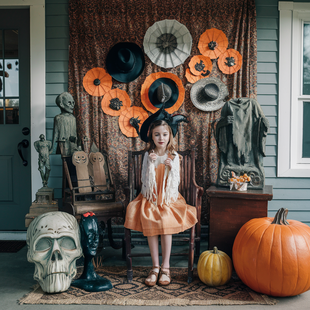 A vintage Halloween photo booth is a nice way to both ferry the past and stay immersed in the ambiance. Use a background from old fabric or some printable stickers, and accessorize with such vintage items as old hats, masks, and sculptures. The interior of the room could be used, e.g., setting up indoors in a living room or hallway, or setting up on your front porch as an outdoor variant. Remind guests to wear costumes from a time past to go the full mile and make it forever worthwhile.
