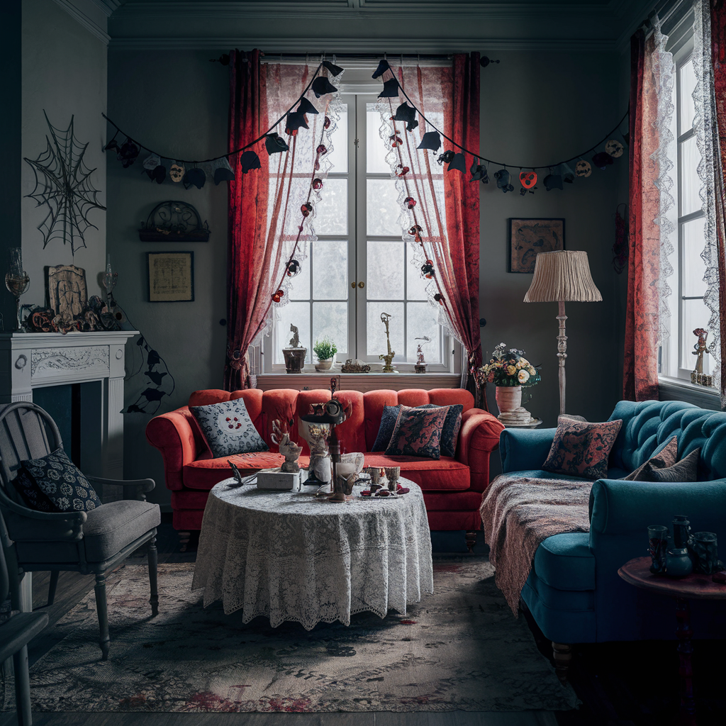 Old-fashioned fabric is a fabulous and flexible material for your Halloween decorations, giving you a way to create a nostalgic vibe. These fabrics, be it lace, velvet, or patterned cotton, can be used to make tablecloths, curtains, or even bunting to hang around your home. By draping vintage fabric over furniture or using it as a background for your Halloween display, you can create a warm, traditional, and even nostalgic feeling. You can also use other materials to create a rep for the design. For example, add old buttons or ribbons to give them a more whimsical look.