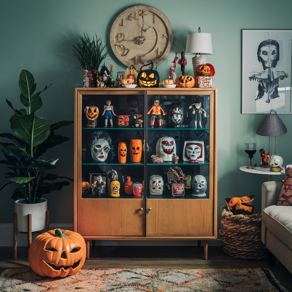 A vintage Halloween items display cabinet can look like an art piece in your home. Repurpose the old Halloween masks, retro toys, antique candy containers, or figurines for any inclination in the cabinet. Each shelf can be a snapshot of a very curated Halloween past, organized internally to relate items to one another. It can be a focal piece in your indoor living room or hallway and thus, guests are encouraged to explore the withstanding age of Halloween decor.