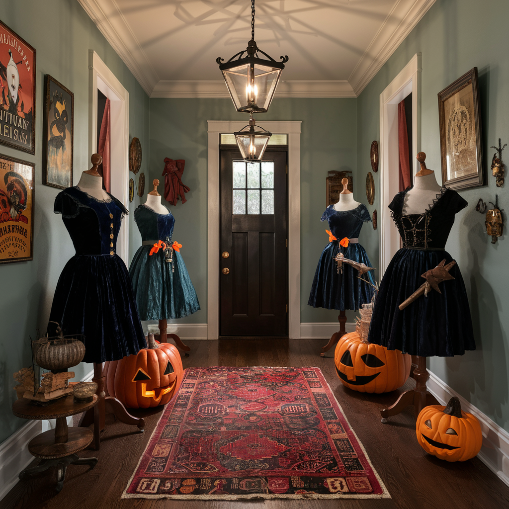 Halloween costumes are a central element of the celebration, and thus, vintage costumes are a great way to get both fun and nostalgic. Dress forms or mannequins can be used to show off classic costumes like witch dresses, capes, and old-style masks in your house. These murals can be positioned in indoor living rooms or hallways to get an eerie atmosphere but yet a cozy one. You may also insert period artwork or posters into the display to make it more interesting and well-connected.