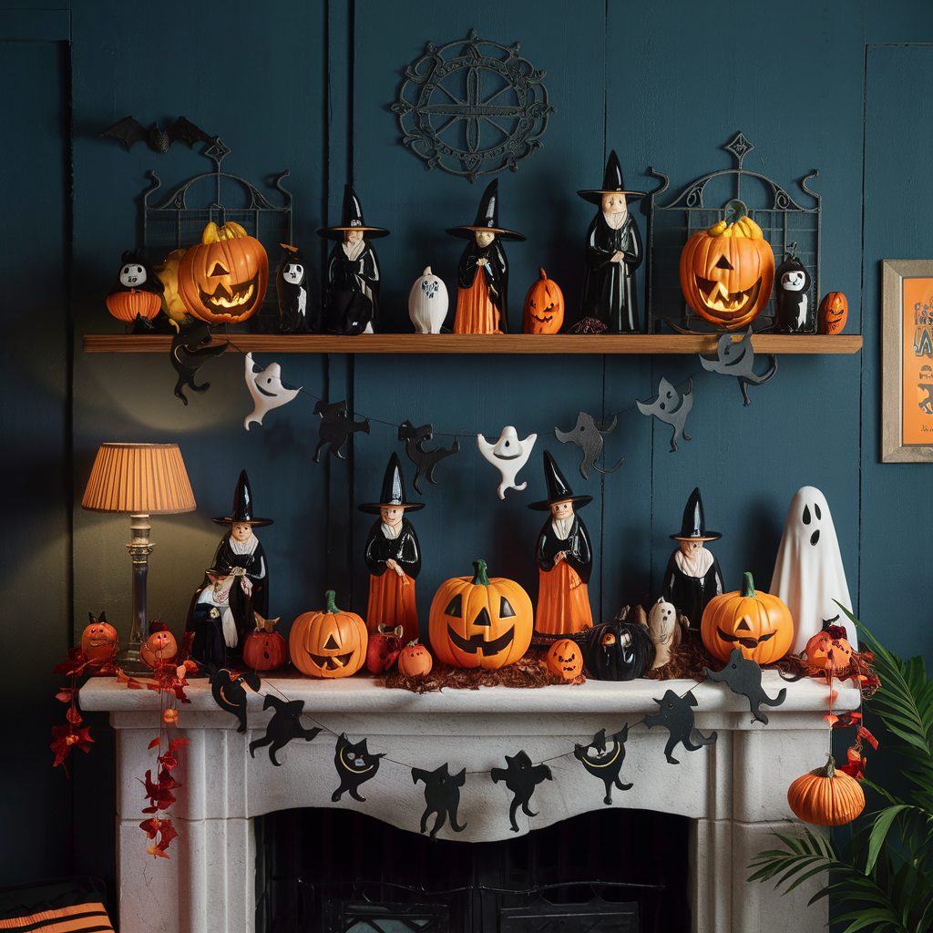 Vintage Halloween figurines bring a vintage vibe exoticism and cozy mood to your places. These little pieces usually show us traditionally Halloween scenes: witches, black cats, and ghosts and you may display them on shelves, in mantels or as table centerpieces. Search secondhand figurines with a nostalgic look, or make your DIY version, which could be customized to your preferences, to ensure a more personal effect of your decorations.