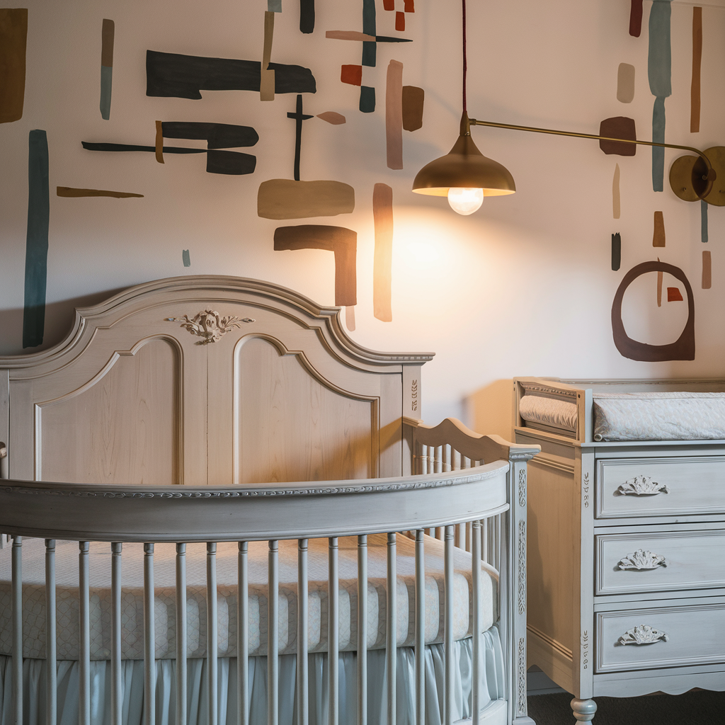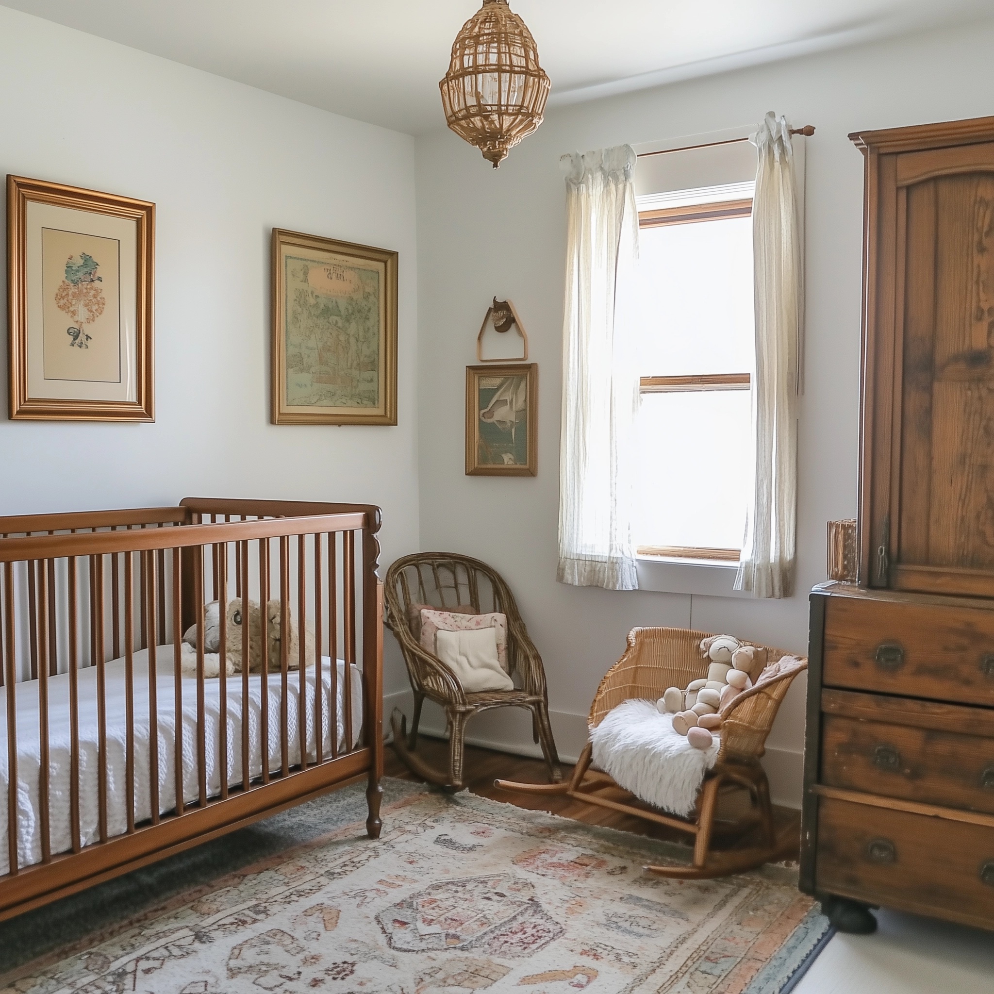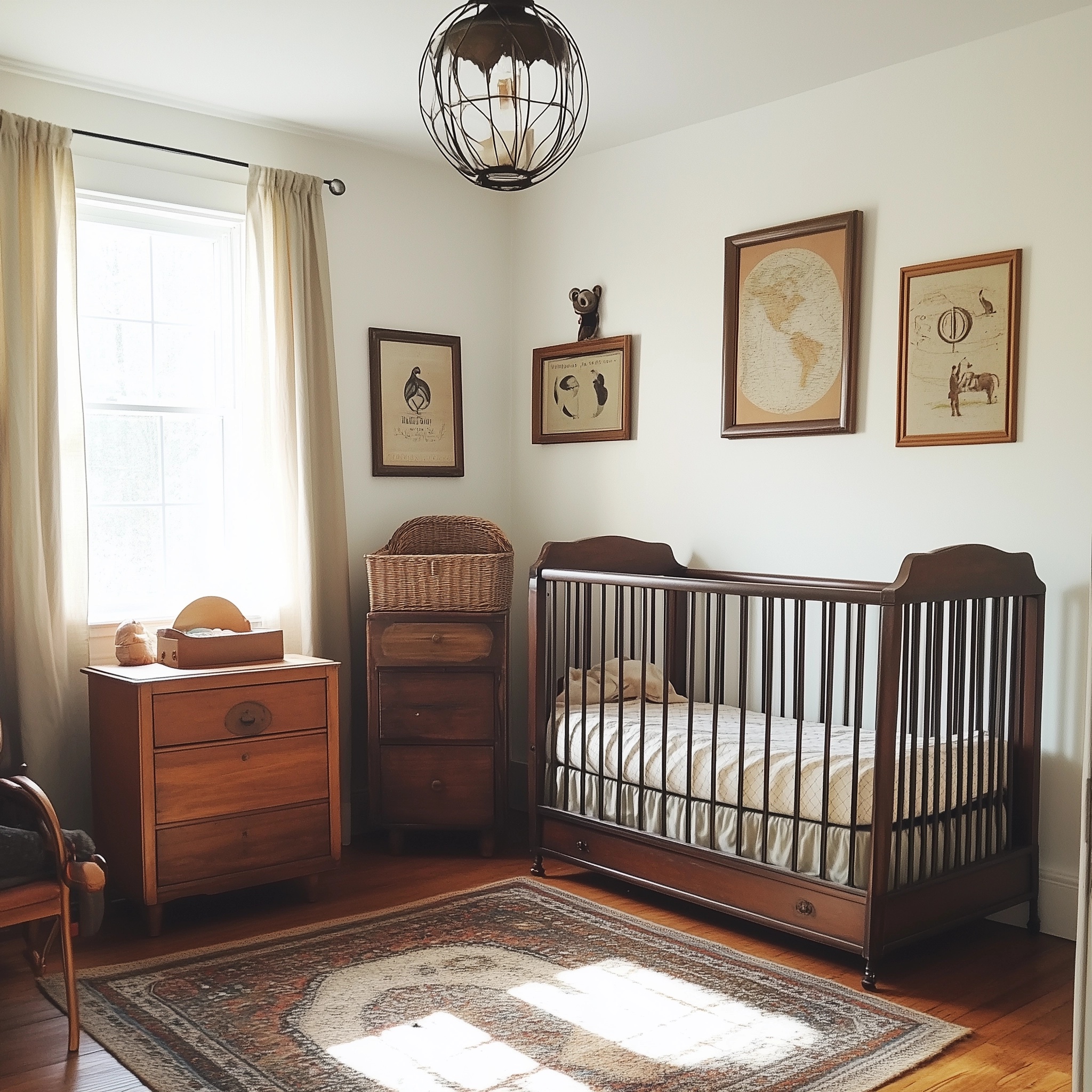 Combining vintage and modern items in a baby’s room evokes a somewhat old-fashioned and a little bit new-fashioned vibe that is very attractive. It all begins with the primary old pieces like a cot or chest of drawers, next bring out the modern effects with lighting, pictures, or other furniture. This combination not only makes the room more versatile but also adds layers of interest. For example, a sleek, modern light fixture can contrast beautifully with vintage wallpaper, or a vintage rocking chair can pair well with a minimalist crib.