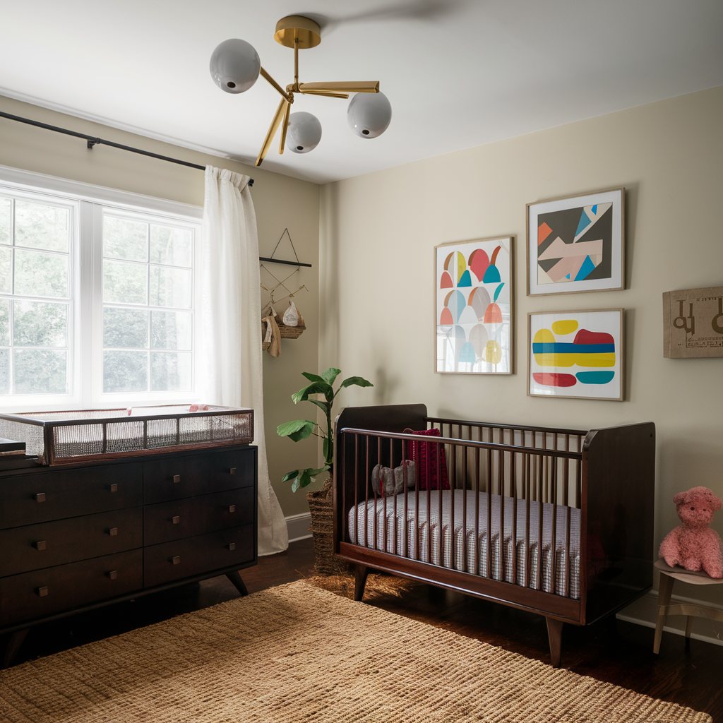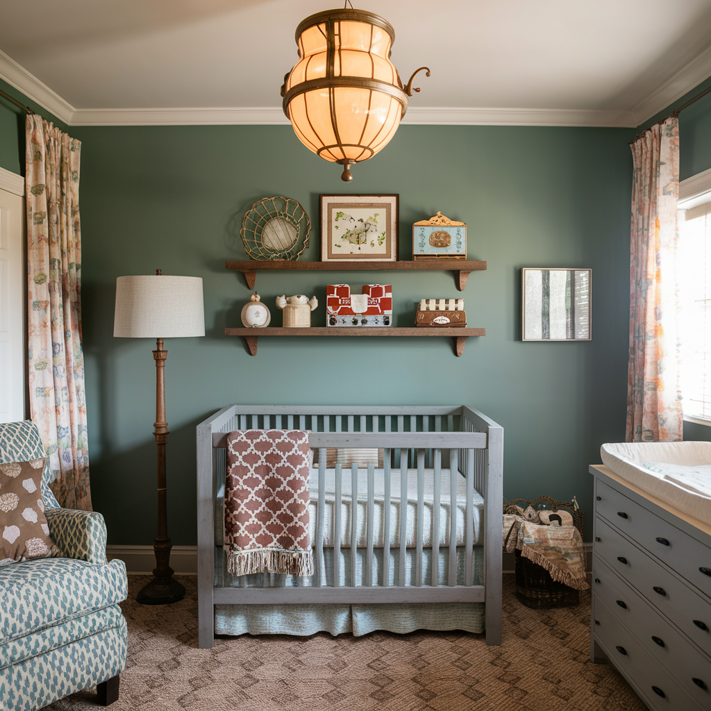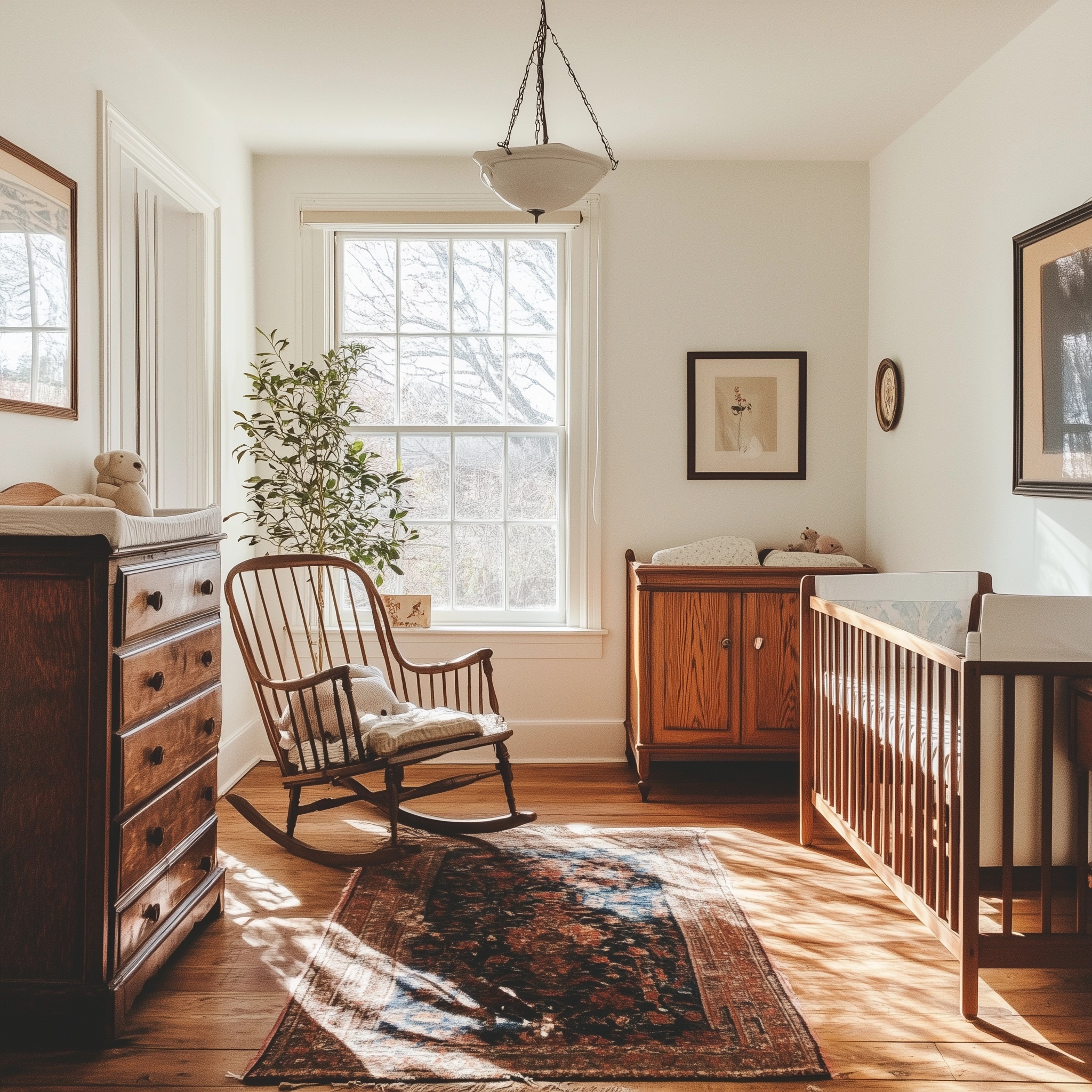 Combining vintage and modern items in a baby’s room evokes a somewhat old-fashioned and a little bit new-fashioned vibe that is very attractive. It all begins with the primary old pieces like a cot or chest of drawers, next bring out the modern effects with lighting, pictures, or other furniture. This combination not only makes the room more versatile but also adds layers of interest. For example, a sleek, modern light fixture can contrast beautifully with vintage wallpaper, or a vintage rocking chair can pair well with a minimalist crib.