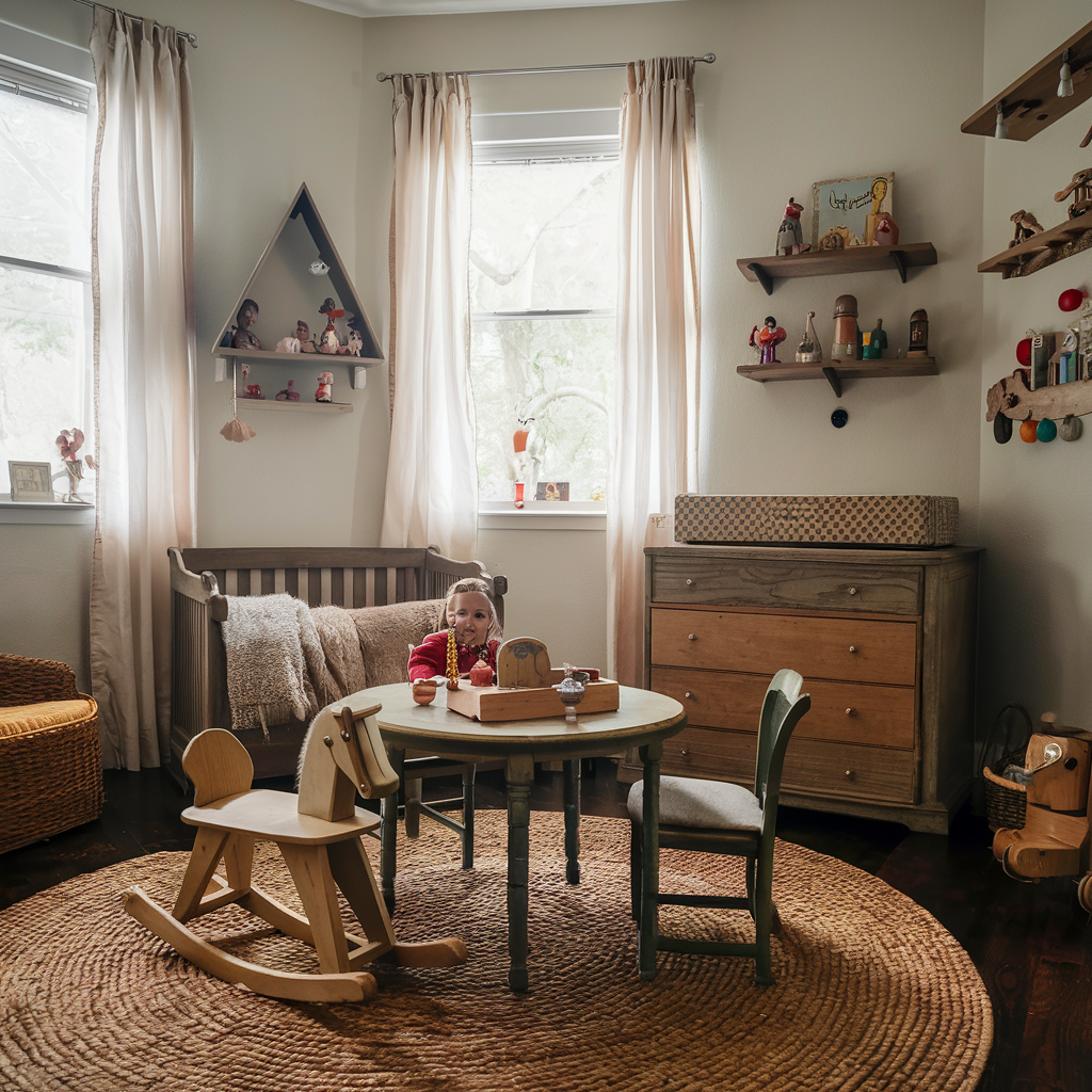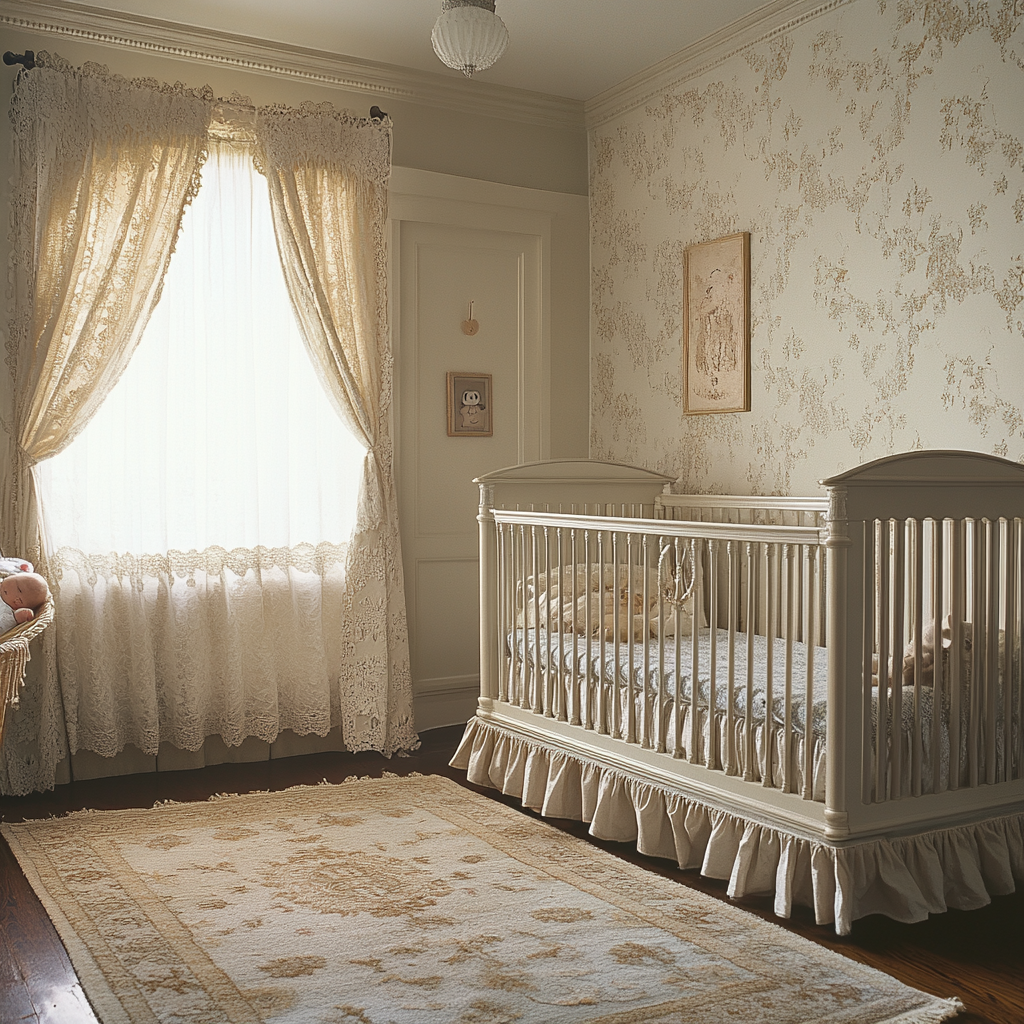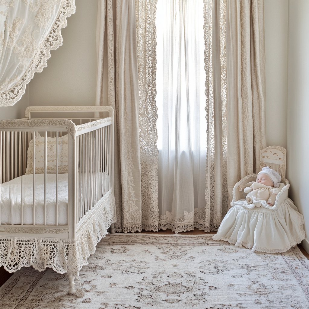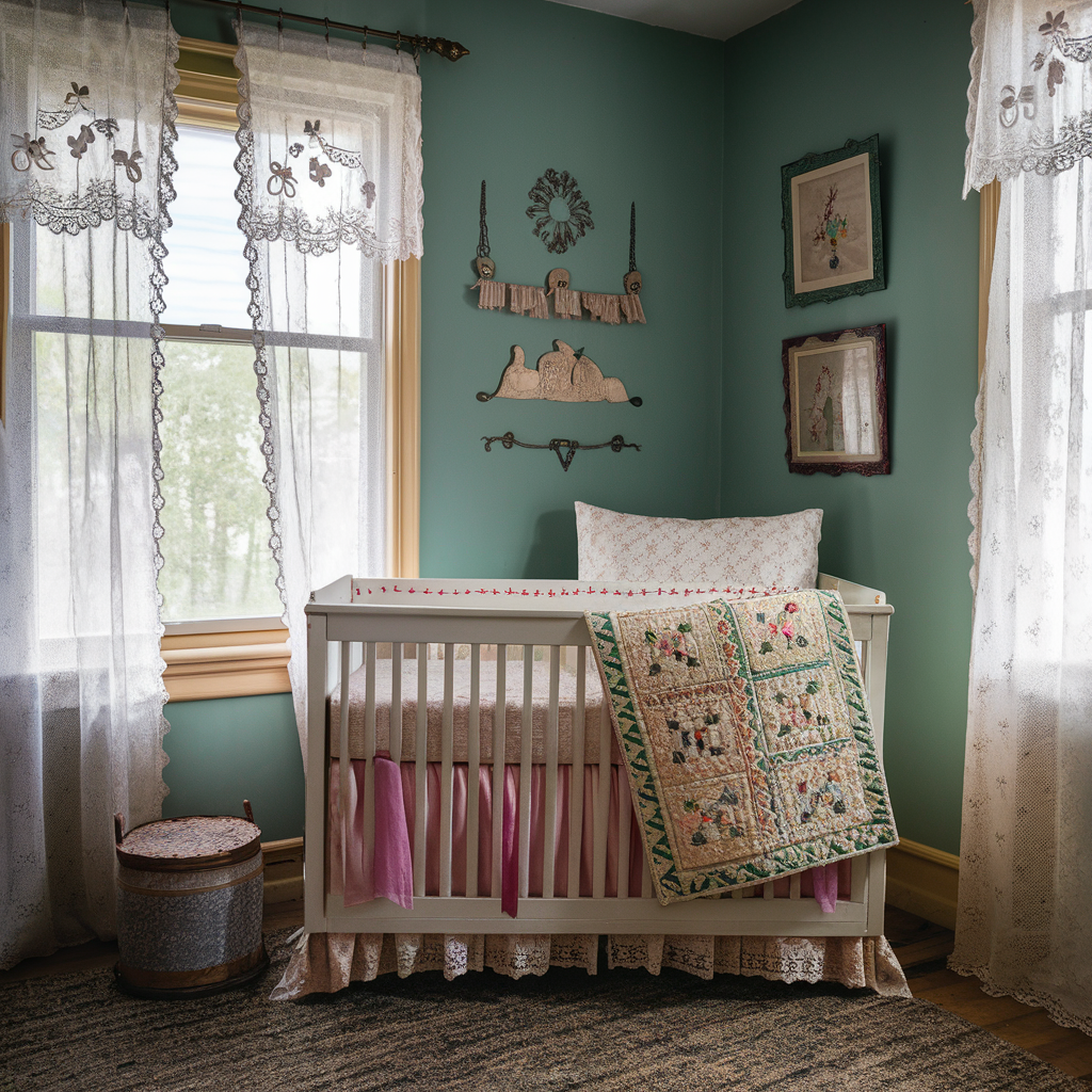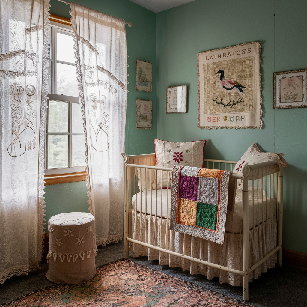 Lace and embroidery became a unique feature of the nursery where a “vintage” touch was added on by incorporating these historically and artistically interesting materials into the room. Lace curtains, embroidered pillowcases, and the handcrafted quilt must be introduced exploiting these elements subtly. The above-mentioned textile localizes the use of history and craft as forms of representation, while meanwhile the spatial dimension is still there.