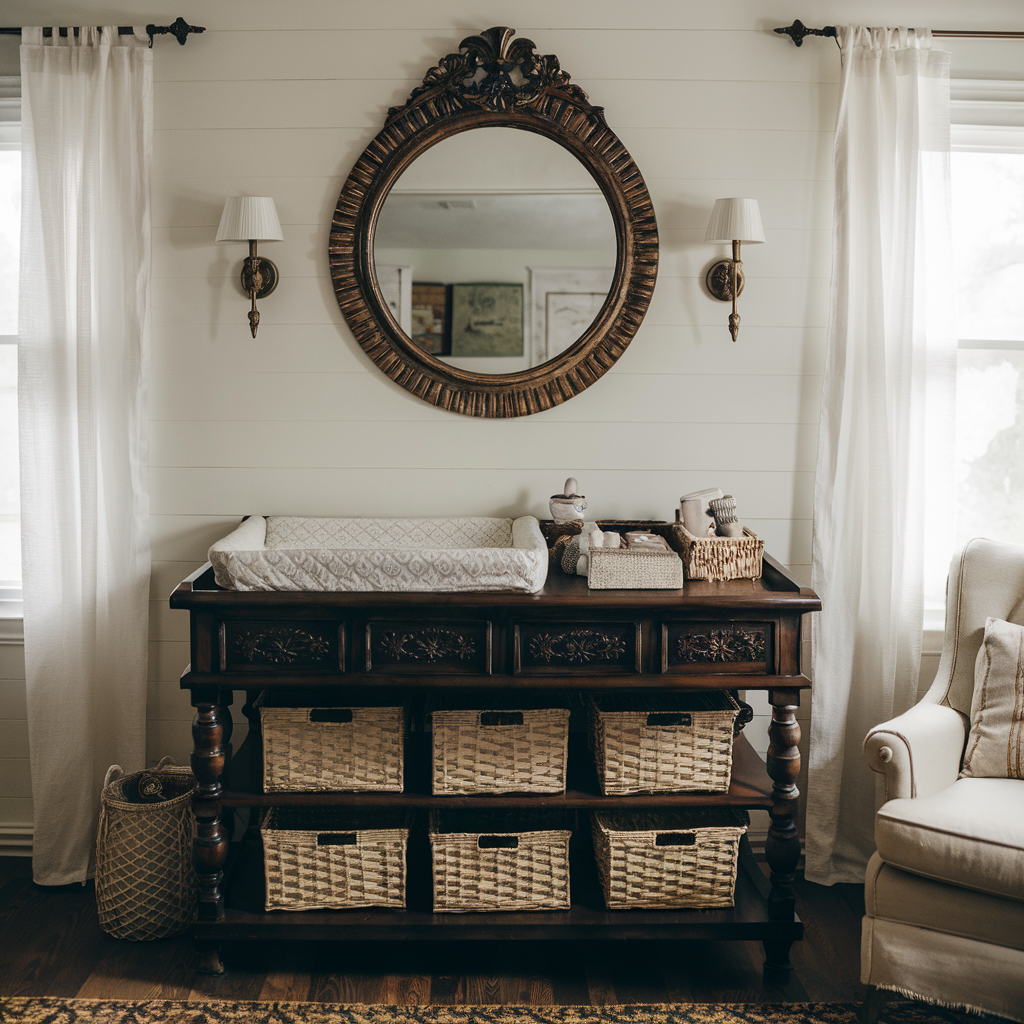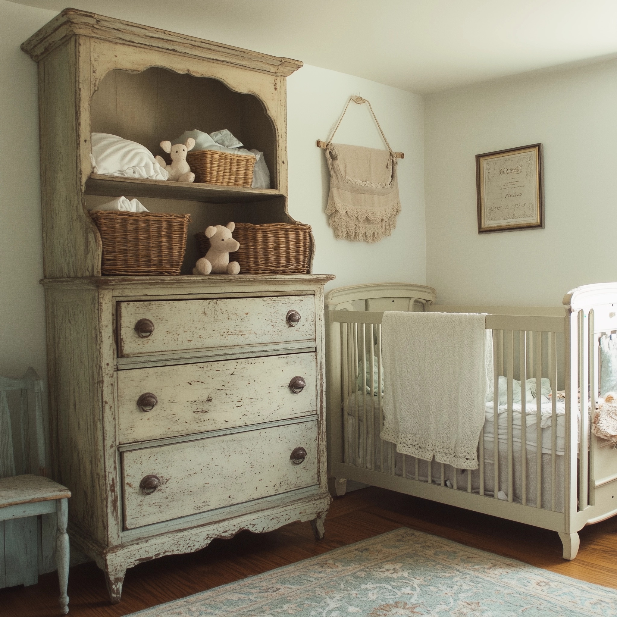Storage is vital in an infants room, vintage or not; however, in a vintage room, you can turn storage solutions into design features. Vintage dressers, armoires, and chests are the best choices for storing your baby’s clothes, toys, and other baby accessories. Open shelving units with decorative baskets are other practical storage options that can also double as decor elements. Persist in searching for items with distressed finishes or antique hardware to create the vintage look.