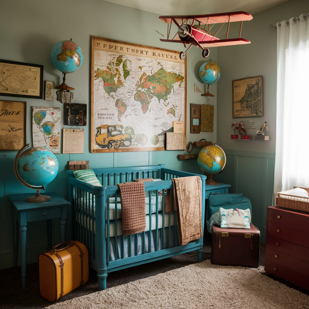 Thinking of a vintage travel theme can add worldly and nostalgic feeling to the nursery space. Adorn the room with vintage maps, globes, and the artwork that is about travel. Turn vintage suitcases into storage compartments or part of the furniture setup if you want. Besides that, travel-related room decor like old postcards, luggage tags, and an old airplane mobile might be attached to the wall.