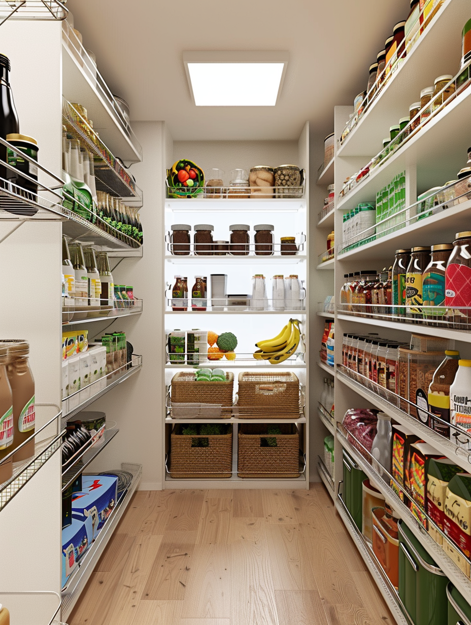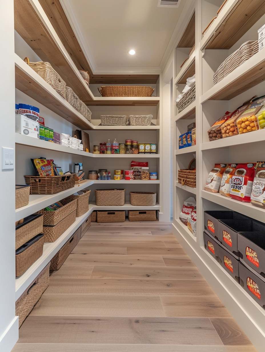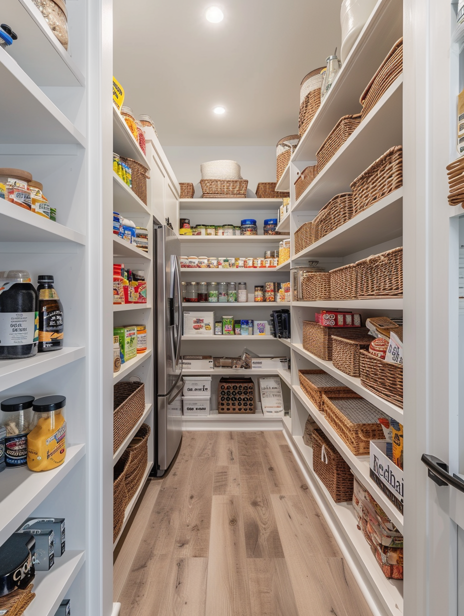 Organization is the soul of any walk-in pantry. Adjustable shelving provides you with the space to change as your storage needs evolve, which makes it possible to rearrange your items. Wide racks are useful for bulky stuff, whereas thin ones are great for condiments and small pots. You can maybe use some side baskets to keep everything crystal clear and approachable.