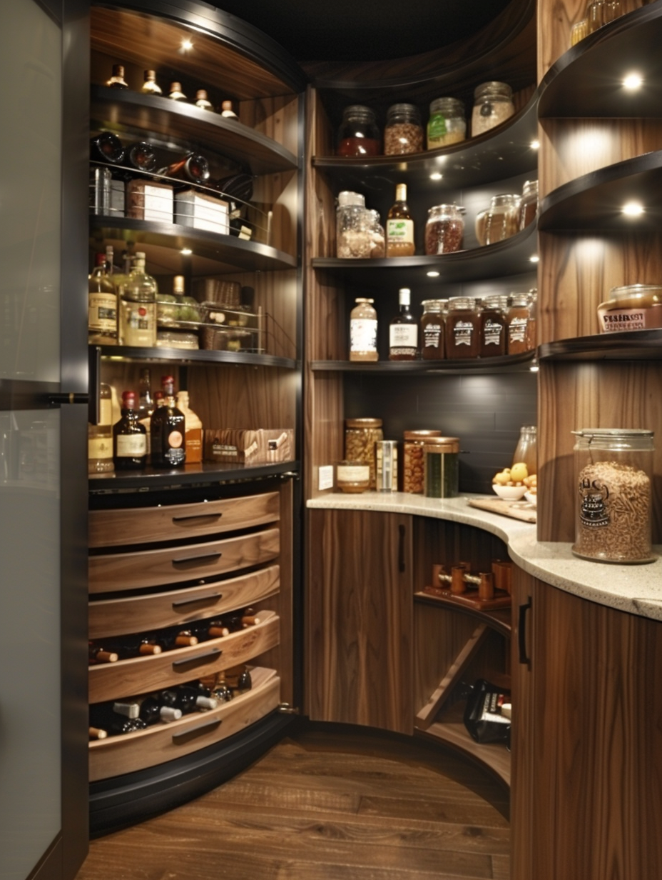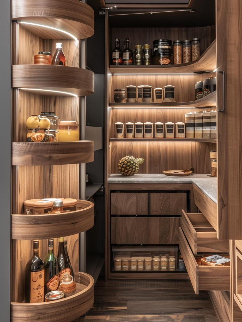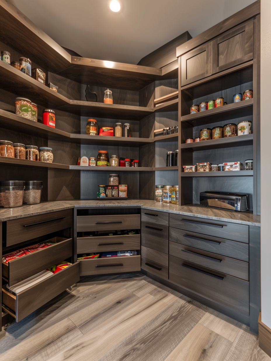 Pantries typically overlook corners. Using rotating shelves or lazy Susans, you will be able to use all available angles to the fullest. Moreover, making corner drawers that can be hidden underneath is another way to solve this problem. With this solution, no house will be empty and your closet will look clean and uncluttered.