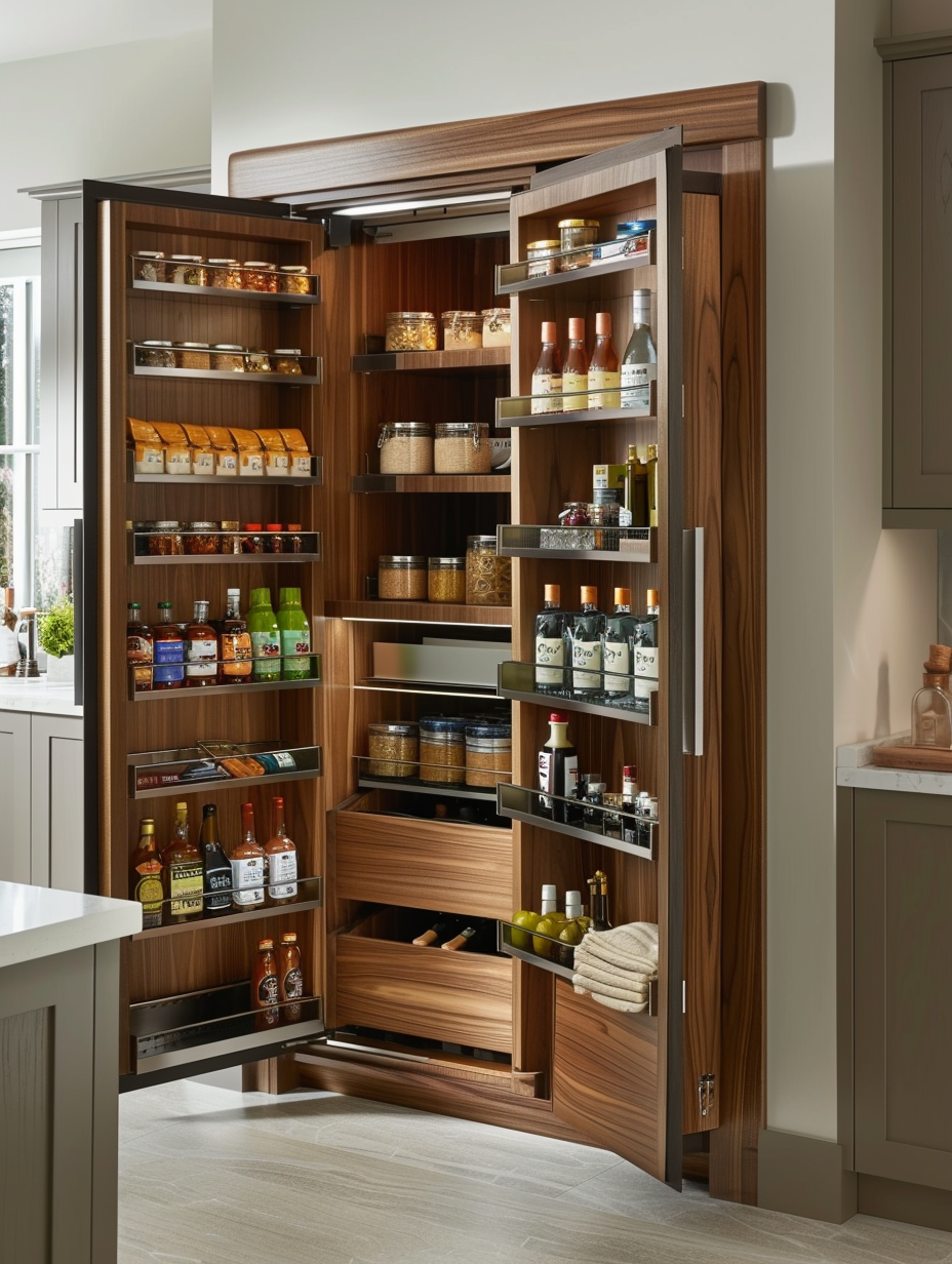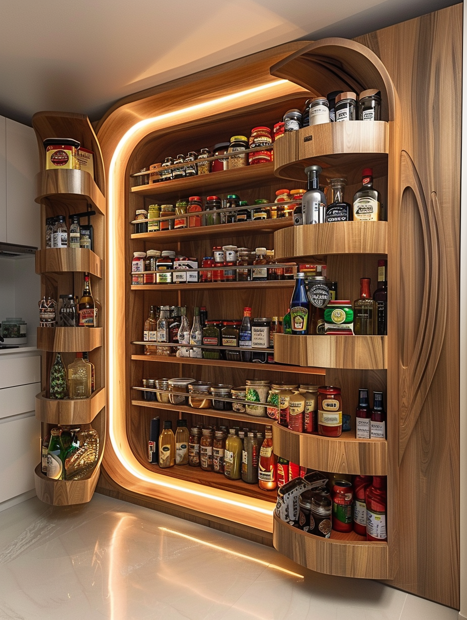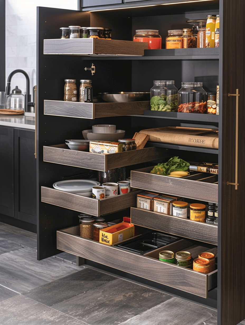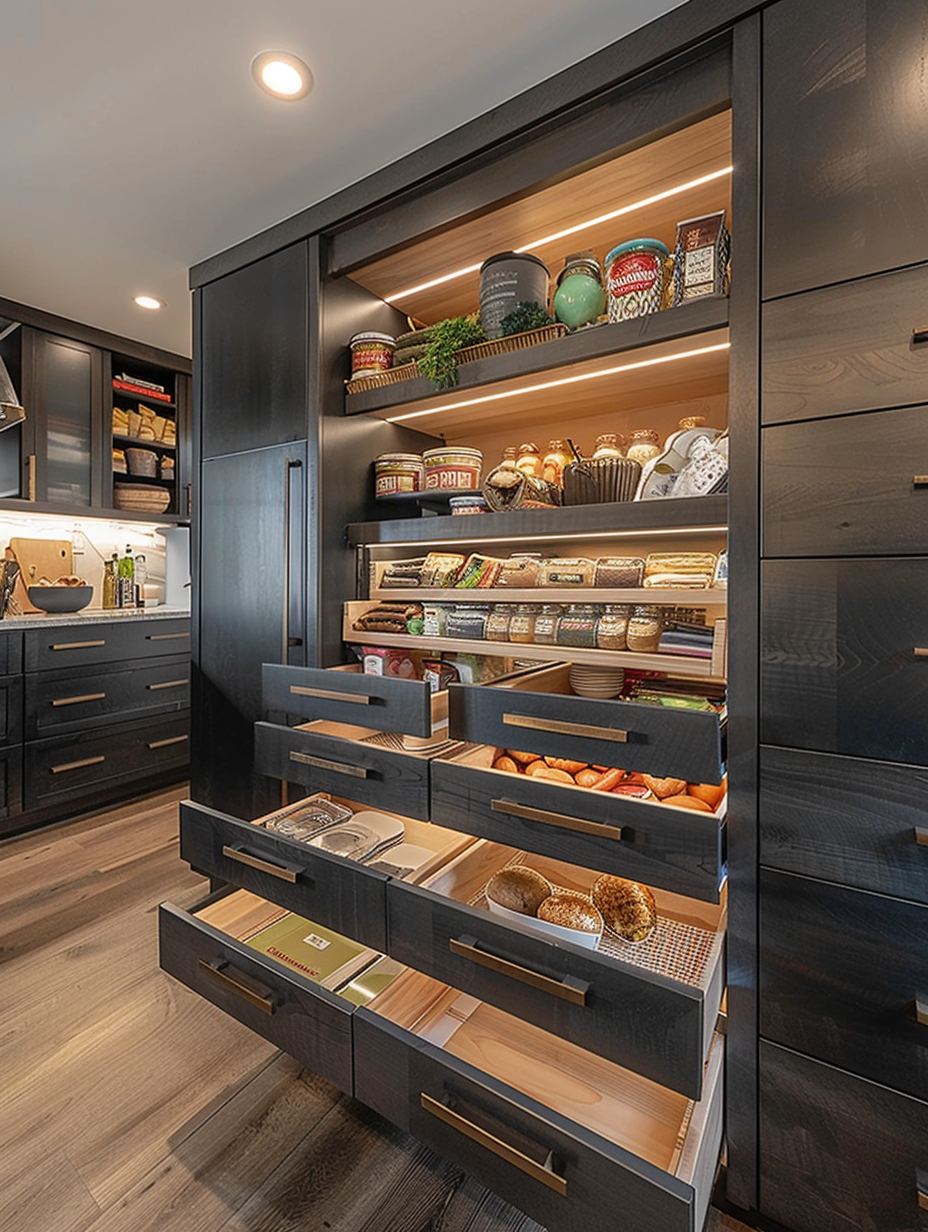 Pantries typically overlook corners. Using rotating shelves or lazy Susans, you will be able to use all available angles to the fullest. Moreover, making corner drawers that can be hidden underneath is another way to solve this problem. With this solution, no house will be empty and your closet will look clean and uncluttered.