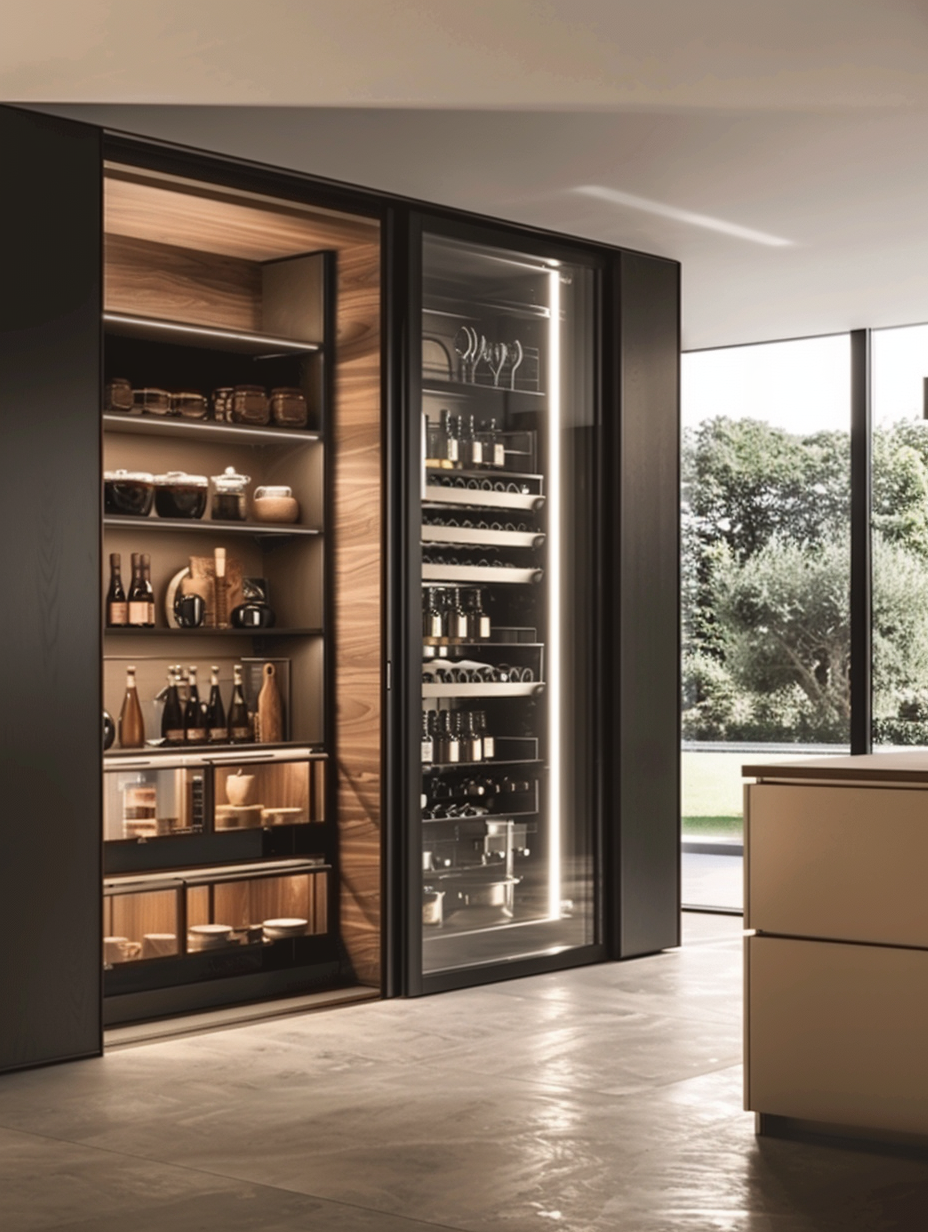 Sliding doors are a great solution for pantries, particularly when space is limited. They are able to pass through the openings without the usual contact with walls, which means they suit tight places very well. Sliding doors can be tailored to coincide with the kitchen’s look, offering a fluid design but with waste space apart.