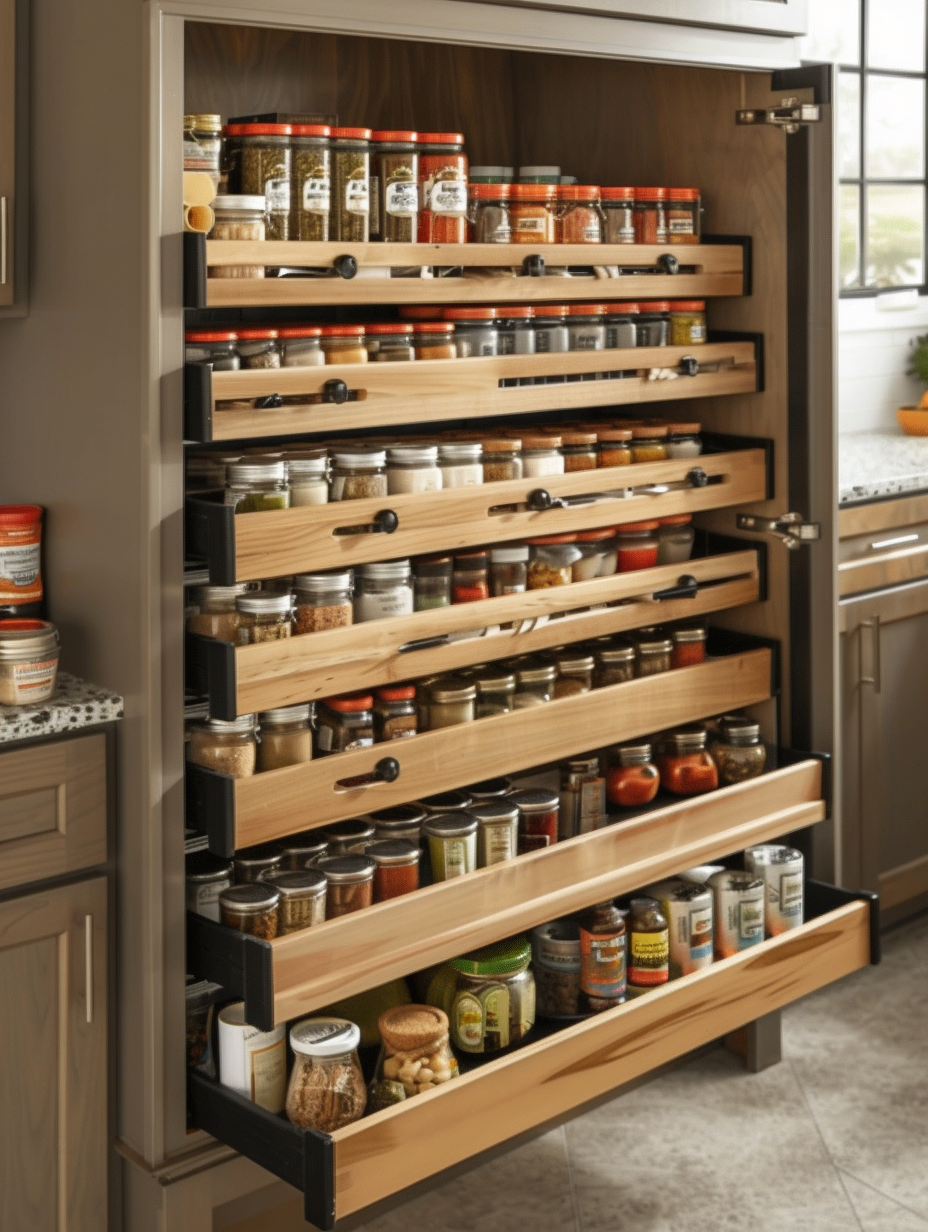 Besides the kitchen drawer, always remember the space on the pantry door. Door-mounted organizers or racks can bring in extra space for spice, snacks, and small things. You can optimize this space to escape from the shelves and to keep easier access to the most frequently used items. Magnetic strips or hooks can be installed for more storage space as well.