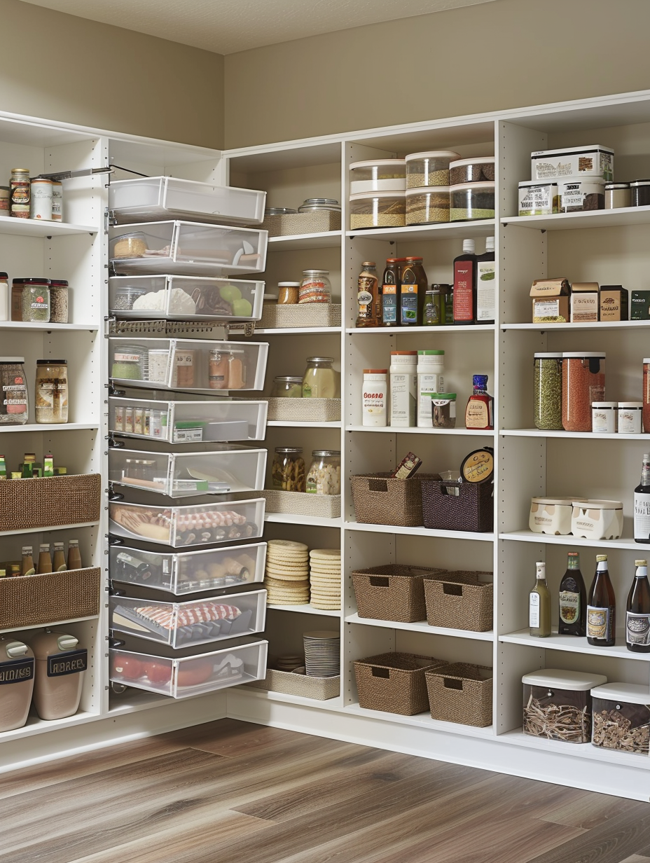 Space-saving storage options can definitely bring effortless operation to your pantry. Take stackable bins and containers to multiply the number of shelves and place everything in a neat order. The main role of these options is to keep snacks, cooking supplies, and dried products. Transparent, stackable boxes additionally cause you to see contents, thus making inventory management a breeze.