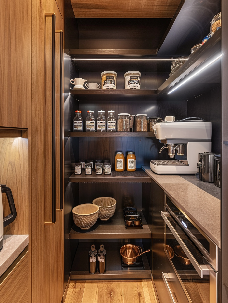 Putting together a beverage station in your pantry is not only a way to wake up in the morning but also a way to keep your kitchen clean. Designate a part of your pantry to coffee, tea and other liquids. Set up mug display boards, incorporate a coffee maker corner, and allocate storage for your tea, and other supplies. This builds a comfortable and organized space for all your beverage requirements.
