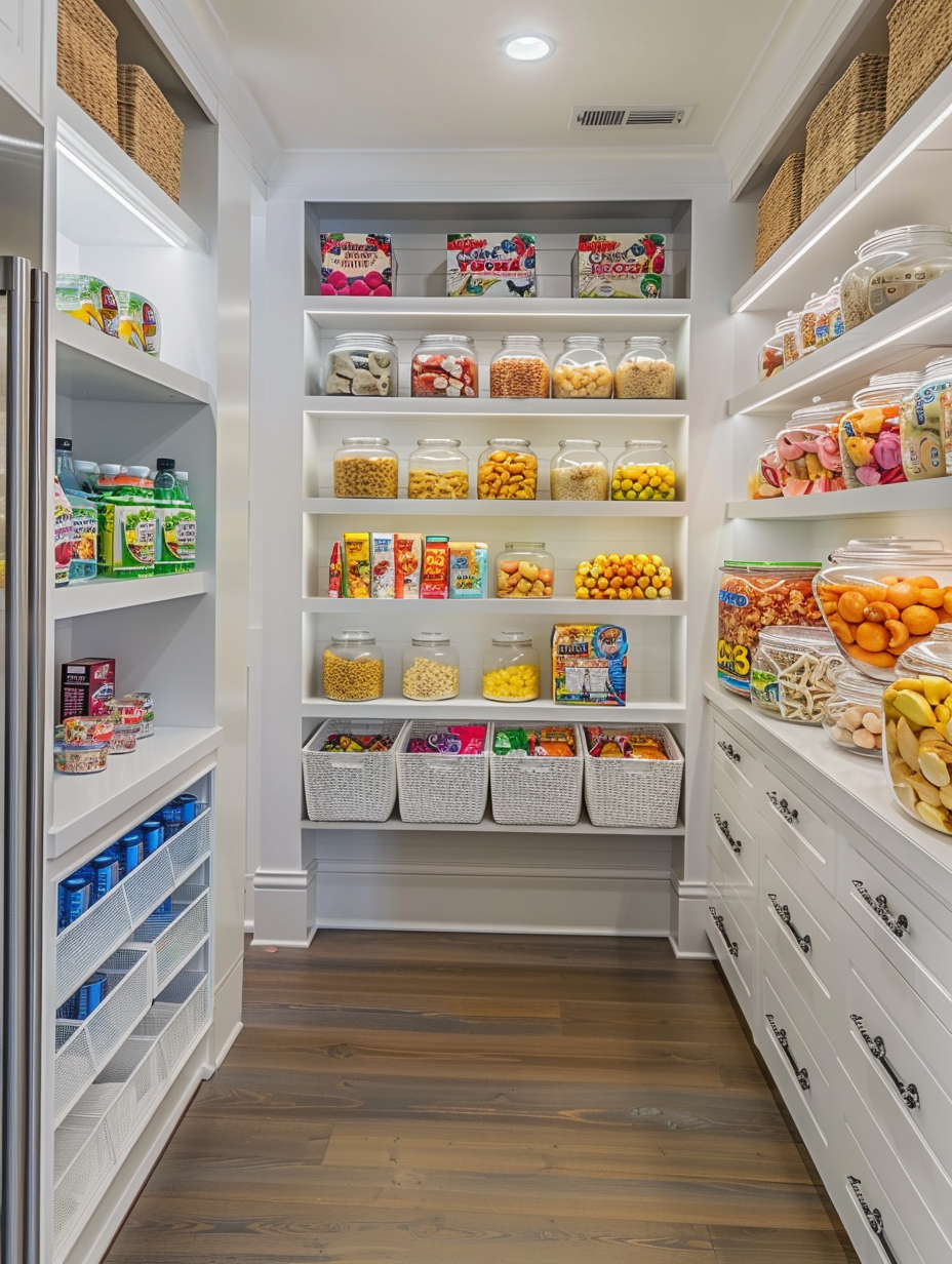 Designing a child-friendly space in the pantry not only encourages independence but also makes it more convenient for kids to pick up their own snacks. Set aside the bottom shelves for healthy snacks and easily accessible containers. Make sure that everything is labeled properly and employ containers, boxes, or baskets to organize the space. This makes it a great idea for kids and also keeps the pantry in order