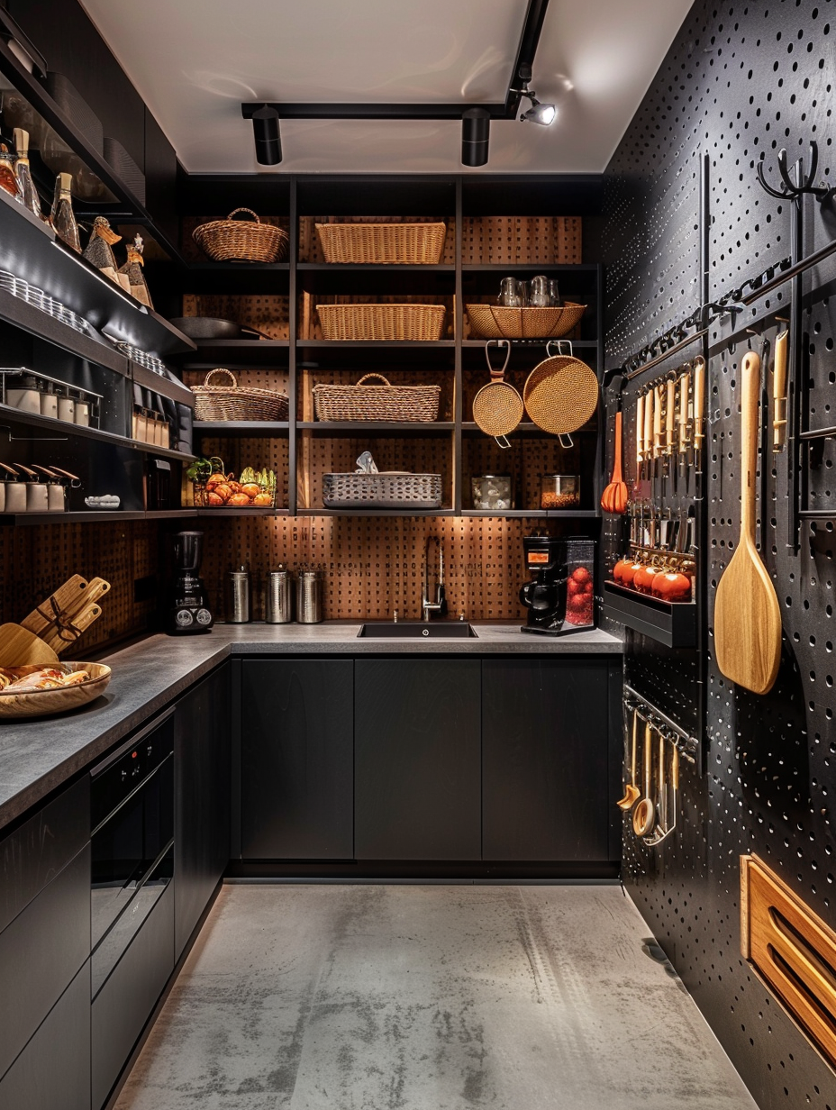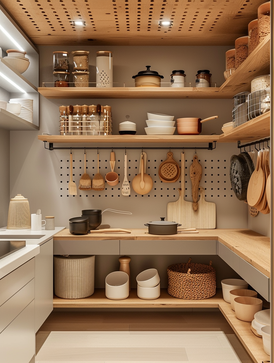 Pantries often lack the utilization of wall space. Utensils, pots, pans, and even baskets can be hung on pegboards or wall-mounted racks. By this, less shelf space is occupied and the articles are in place. Smaller items can be stored in extra spaces of the hovering shelves without taking up any space.