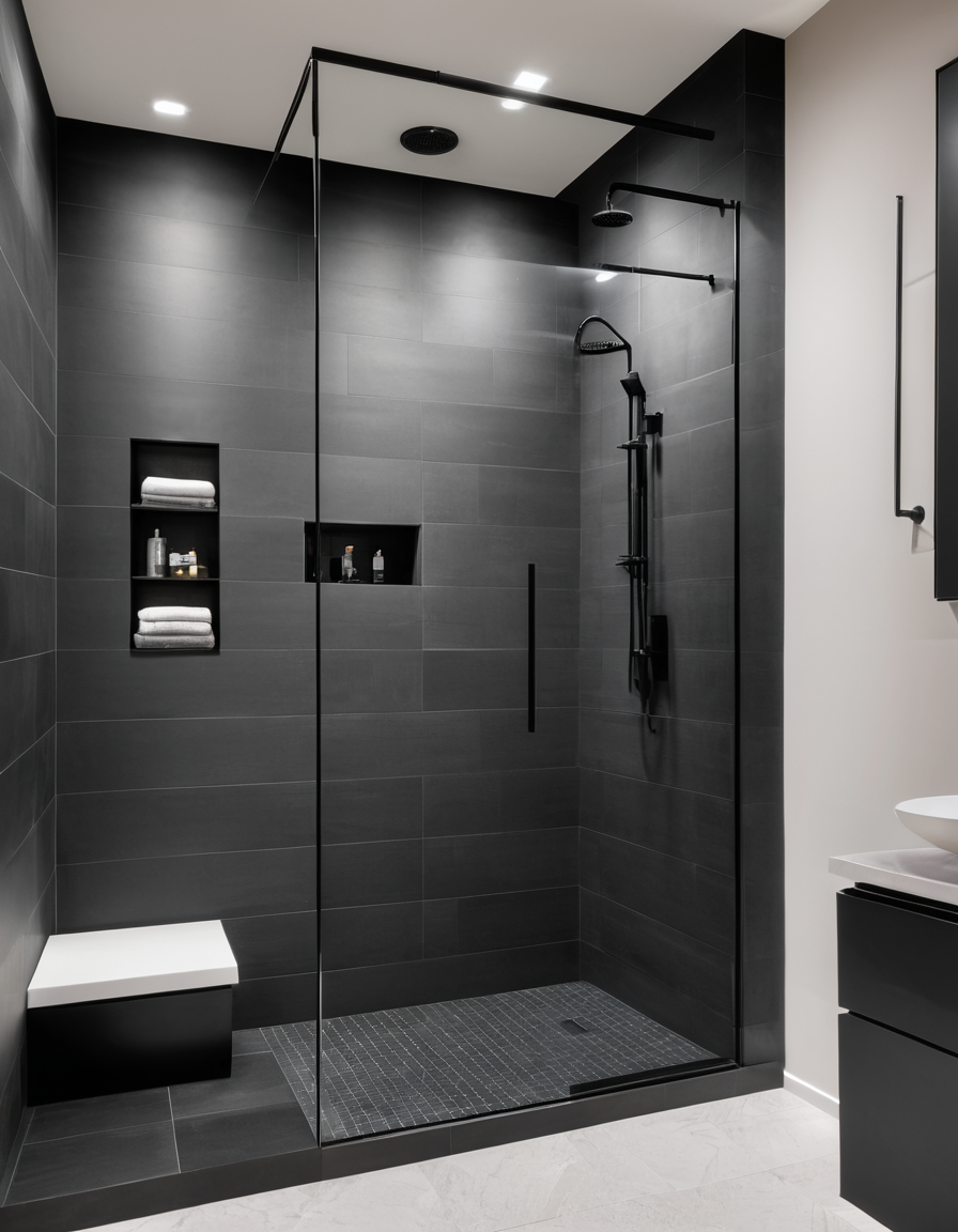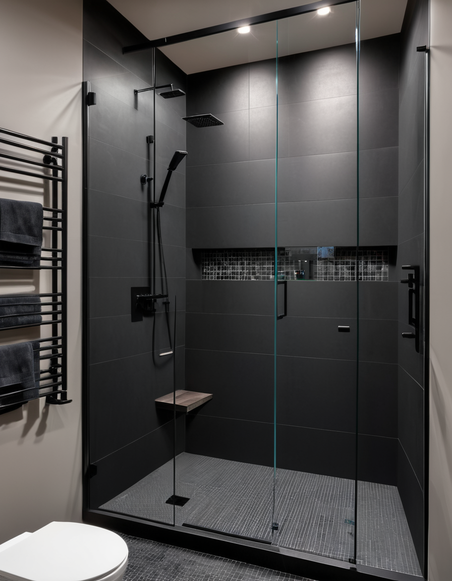Choose a bold, elegant approach to the design by introducing black-themed walk-in showers. This edgy look can be created with black tiles, fixtures, and accents in a bathroom, vividly contrasting them with the lighter elements. The sleek, elegant look of the contrasting dark tones is achieved by using large, dark tiles, and black fixtures. To show off the dark side, glass enclosure and soft, ambient lightening could also be the possible perfect options.