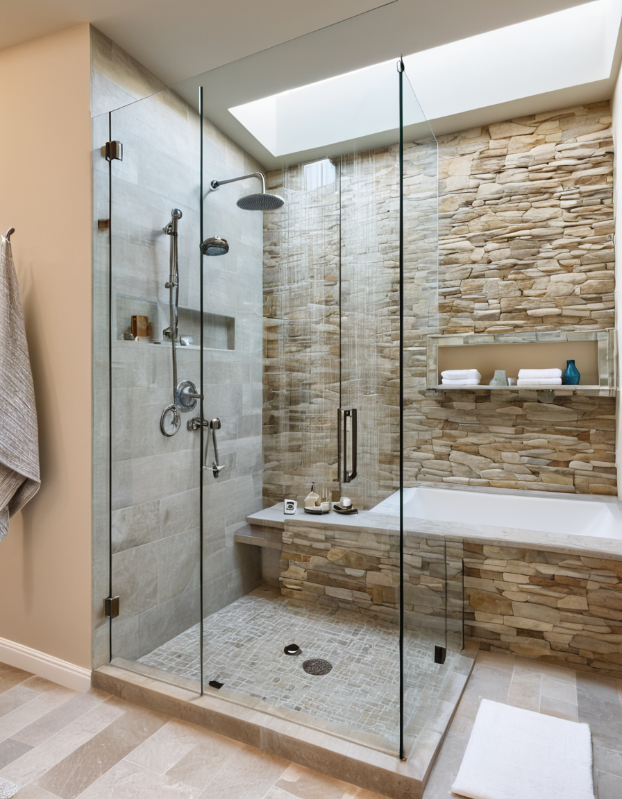 Allocating a walk-in shower in an extensive bathroom can be a conversation starter. Instead, how about a vast floor plan with two showerheads, a built-in young man, and high-end materials such as marble or stone. A see-through barrier may be the best solution for setting off the rack in a room while also keeping the design open and airy. Large showers are the best way to incorporate the most unique features such as a steam function or a custom light.