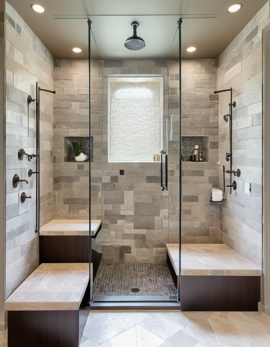 In home spaces where size does not matter – the double walk-in shower is a reminder of how luxurious it can be. This design is the preferred layout for master baths because it can accommodate two showerheads and ample space for movement. For an upscale look, walls of stone or tile are suggested and a bench for additional comfort is considered, too. A double walk-in shower is perfect for couples or those who prefer a more spacious shower experience.