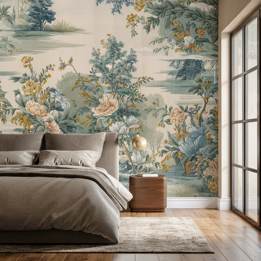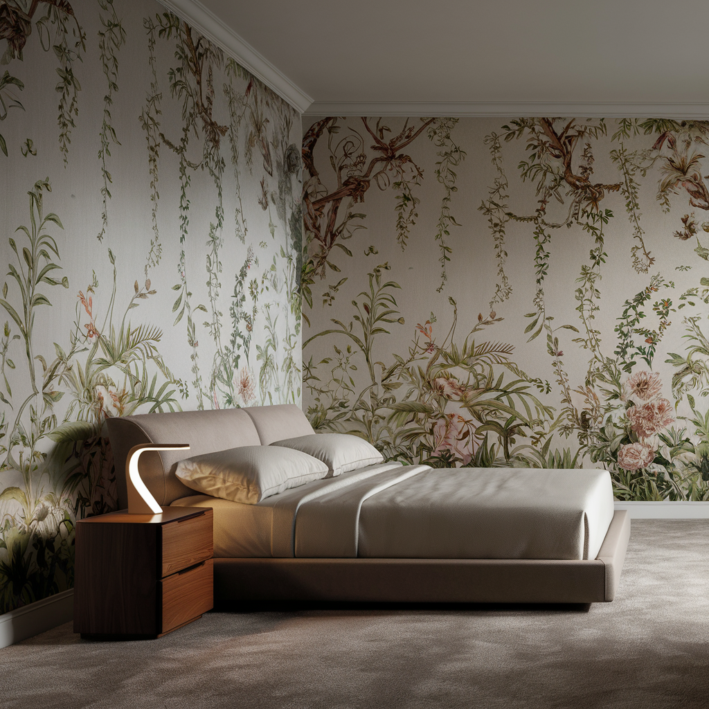 Dark floral wallpaper is an excellent choice for those looking to create a sophisticated and moody atmosphere in their bedroom. These wallpapers often feature rich, dark backgrounds with vibrant floral patterns, making a bold statement in the room. When paired with luxurious fabrics and elegant furniture, dark floral designs can transform your bedroom into a dramatic and stylish retreat.
