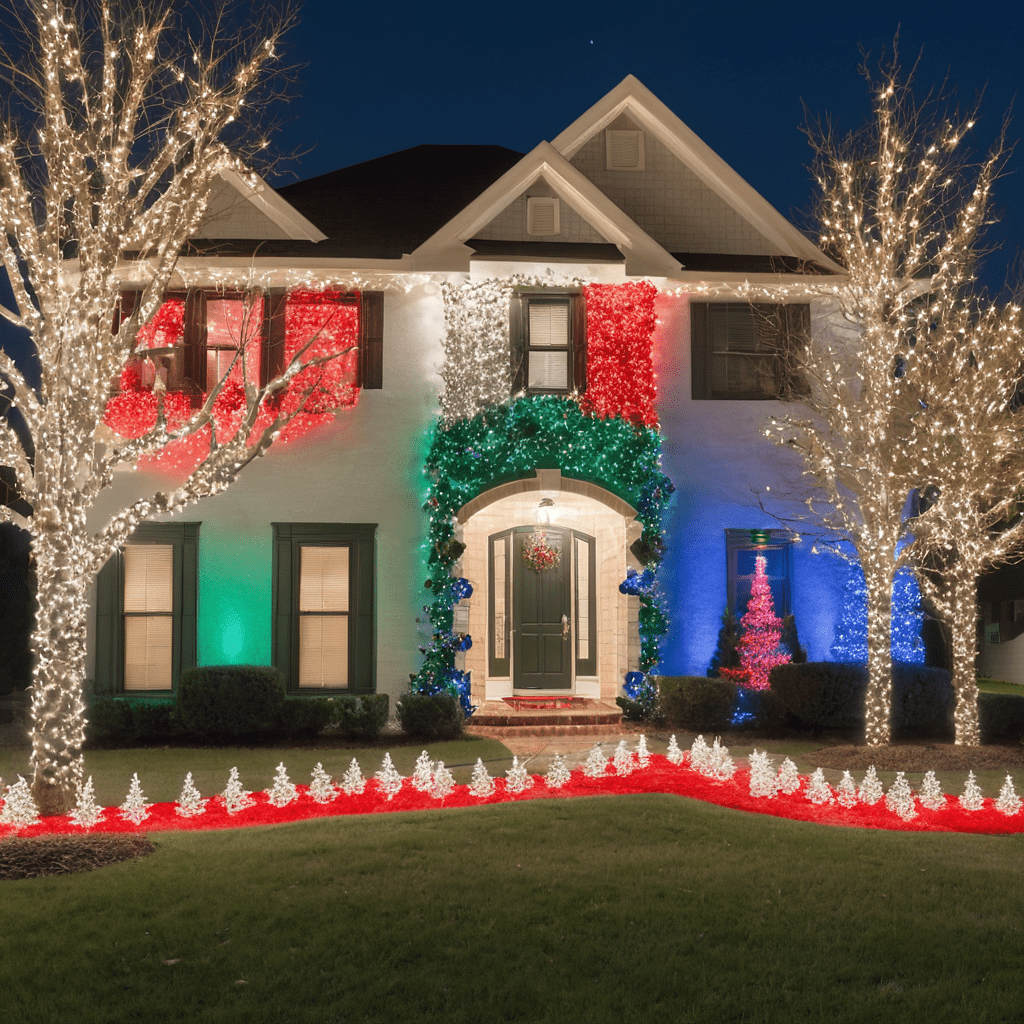 For a lovely warm ambiance and inviting Christmas feel, try to use red and white lights in combination with soft candlelight effects. This spectacle generates an intimate, low-key warmth that works nicely indoors as well as outdoors. You can have red and white lights around the walking paths, on the porch or window sills, and add electric candles to provide more decorative visual effects. The soft, natural flicker of the candles edited the luminous effect, however, and defined the ambiance with a little extra warmth and coziness. This is the setup that will totally satisfy those who want to come up with a home environment that is festive but also restful and pleasant.
