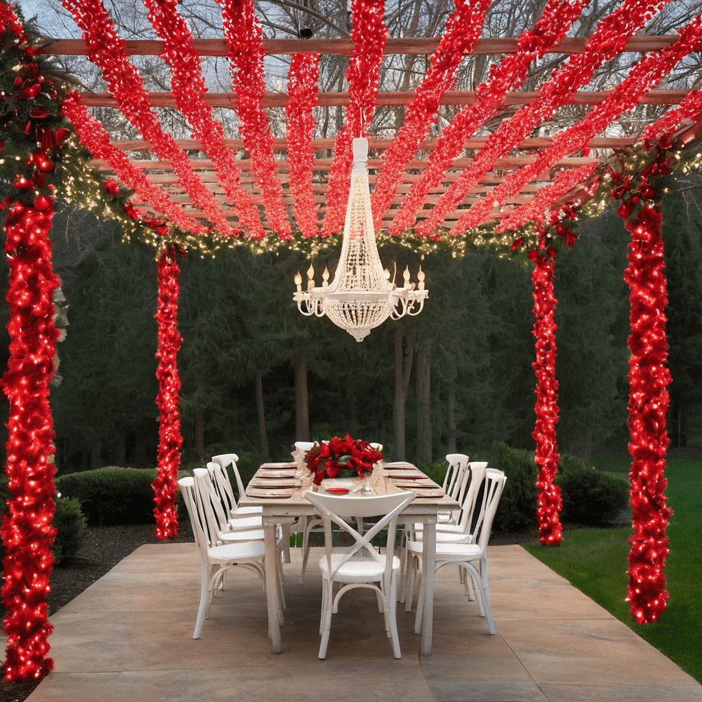 Revive your outdoor living spaces by adding charm with red and white lights hanging from outdoor rafters and pergolas. A more significant sweet effect to the moment is a set of indoor or outdoor lighting. The lines can be hung vertically or horizontally depending on the rafter or pergola structure and petrifying detail of the clefts. The red and white lights’ warmth envelops the area with the holiday spirit, making it seem cozy and inviting. This idea functions especially well for those who want to continue braving temperatures outside even in the winter season.