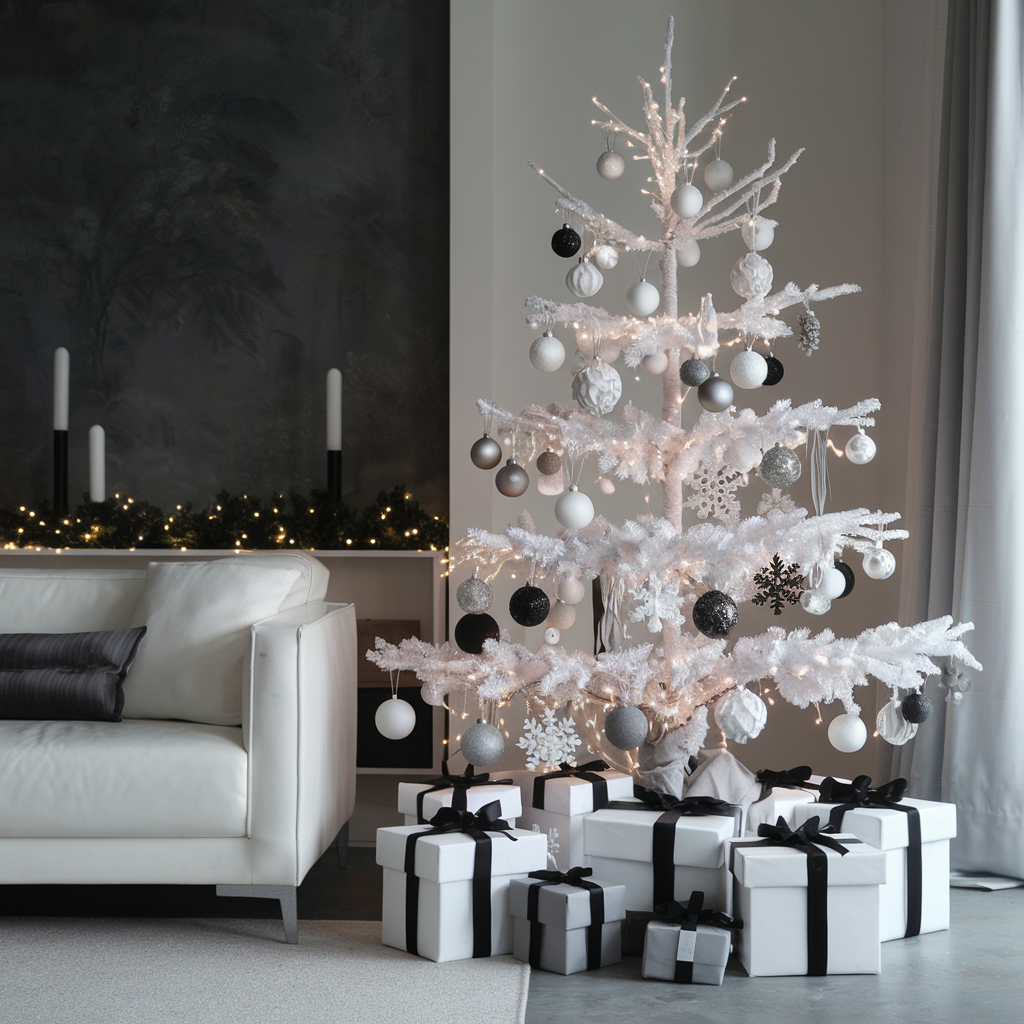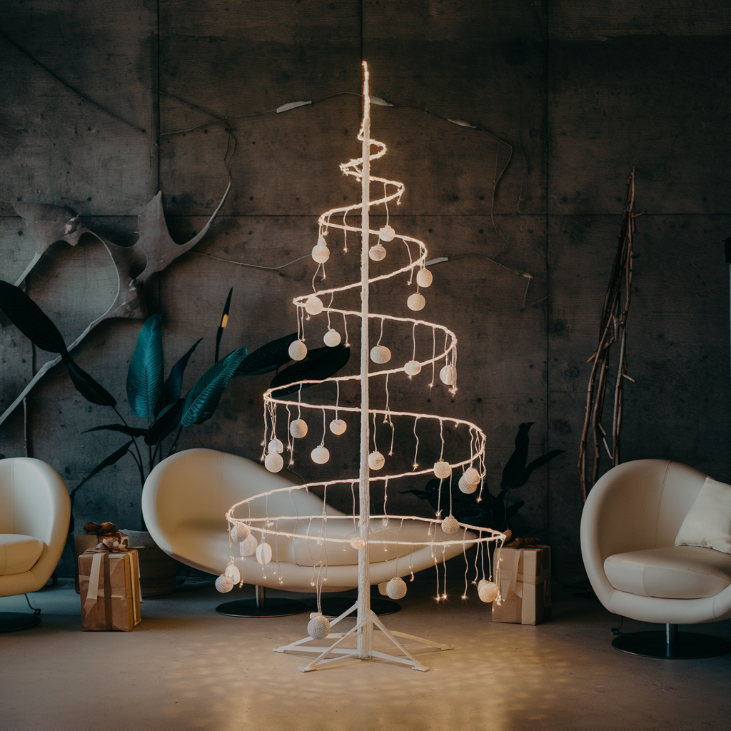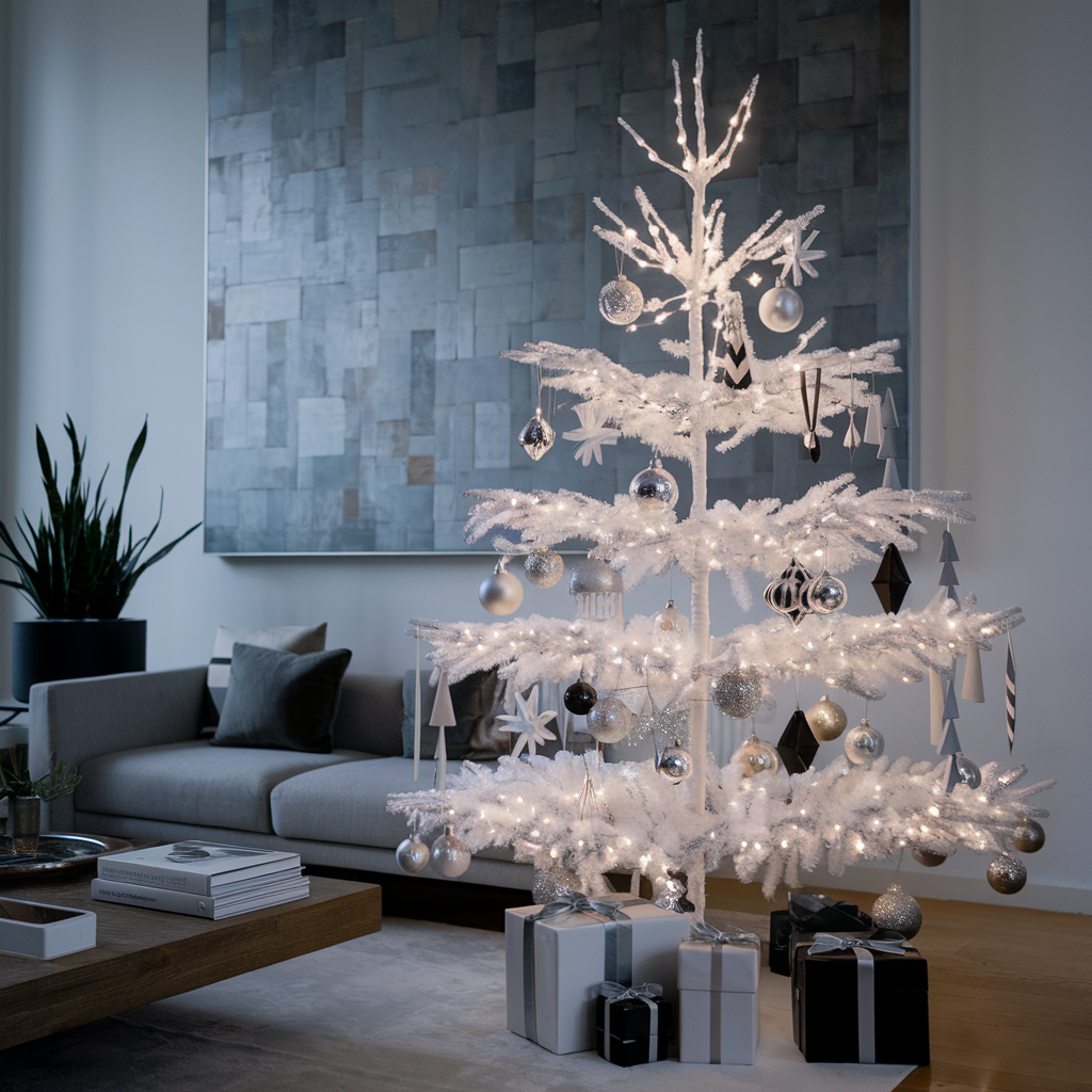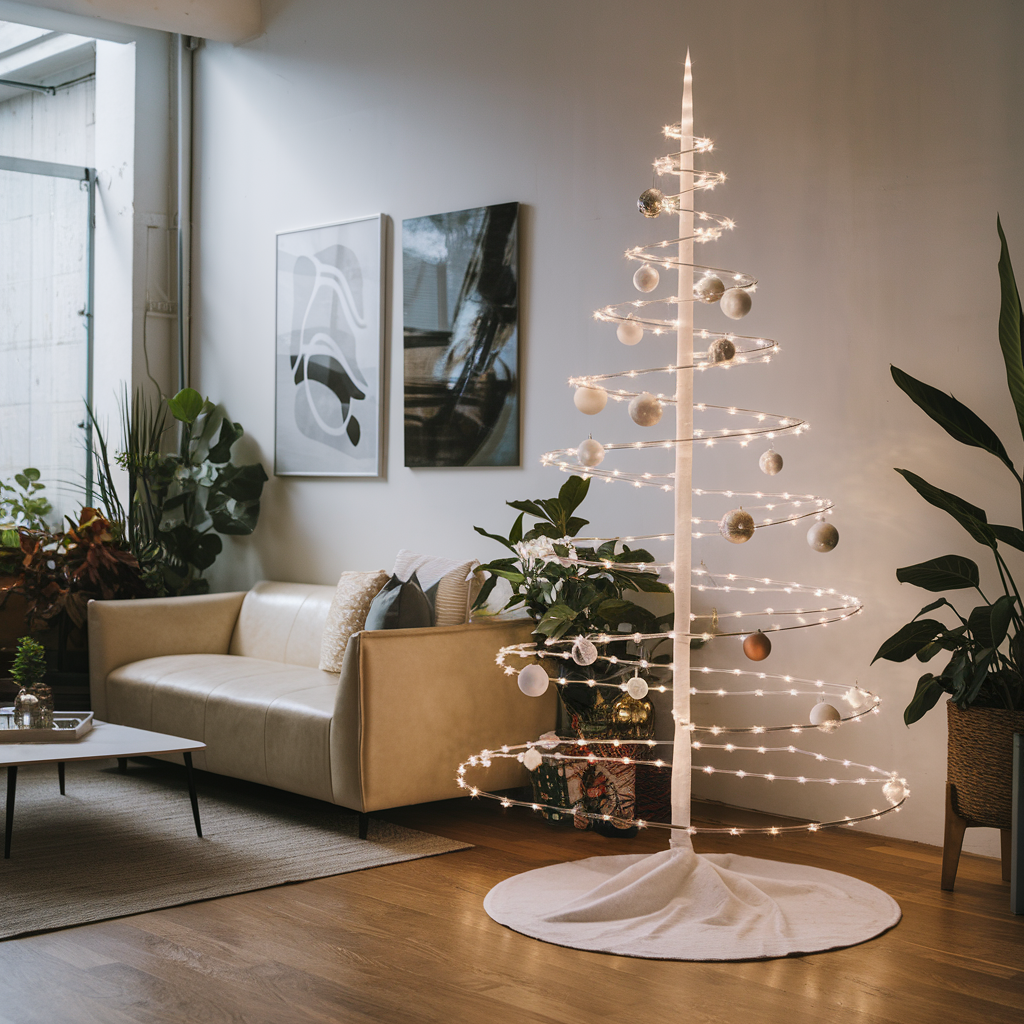 If you are one of those who are more into a modern and quirky style, then a white Christmas light tree design with a contemporary twist is a perfect choice. Choose white LED lights of sleek design and add them to the monotone or metallic ones in black or silver. Make use of geometric shapes and add minimalist decors such as clear glass baubles or wireframe stars to contribute to that modern vibe. This style is perfect for a chic, urban-dwelling where the key is minimalism.