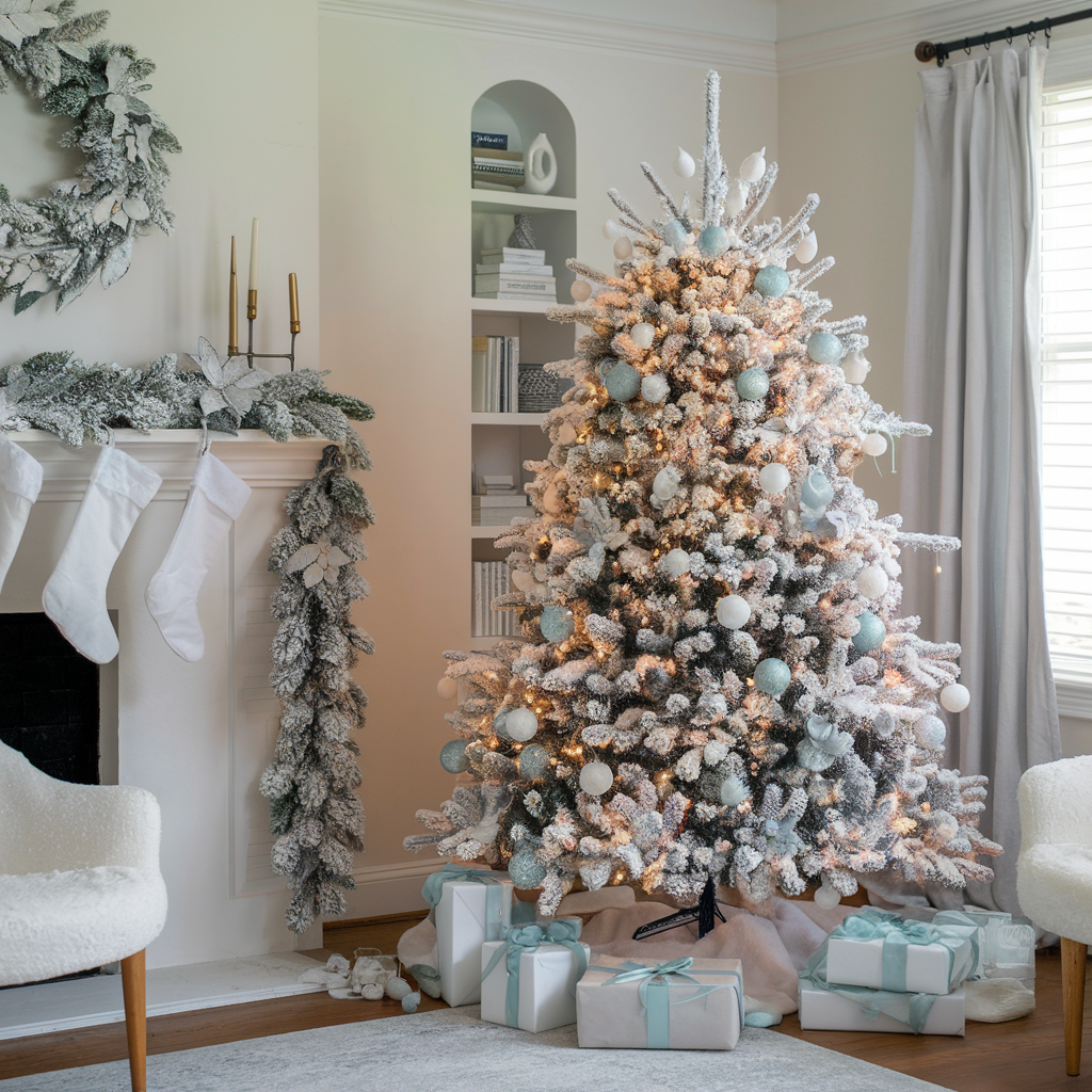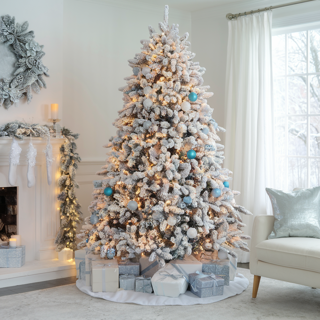 The bright shiny white flocked Christmas tree flocked with artificial snow can be an awesome background for your white Christmas light tree idea. The white light manipulates the snowy surface, making the tree radiate with the frosty magnificence. Complete the look by adding silver and blue ornaments, which work well with the snow-covered look, and add a few sparkly touches of glitter for extra elegance.