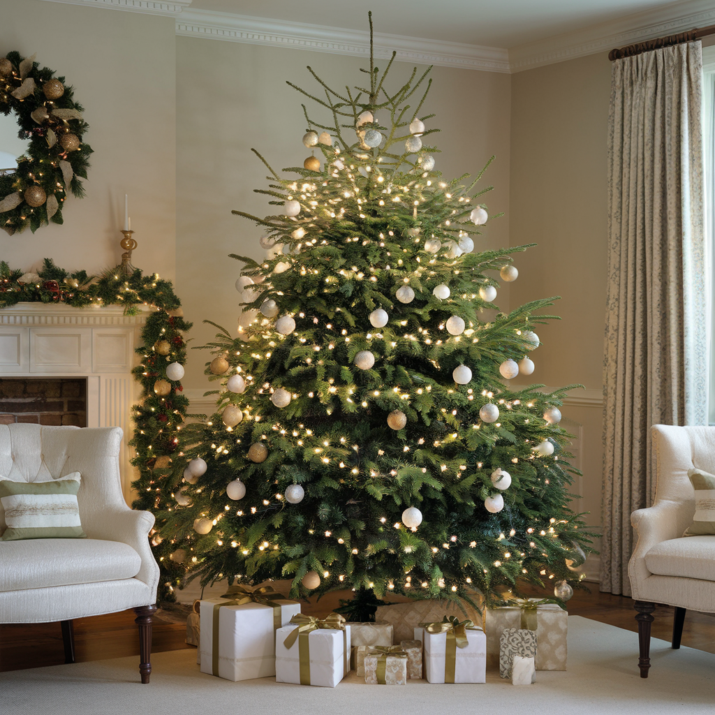If you are a fan of the timeless green Christmas tree, white lights are perfect to elevate its natural appeal while adding depth and dimension. Start by wrapping the lights close to the trunk, and then gradually move outwards to the tips. This method makes sure that the tree is uniform, lush, and full. Match the white, gold, and green ornaments with the lights for a seamless and festive look.