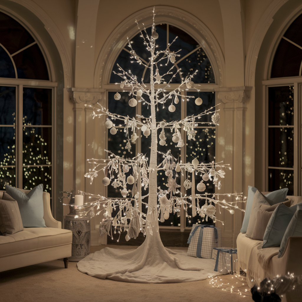 For every family that holds dear to tradition, a holiday display of white Christmas light trees is a suitable option. String it around the edges of the tree with warm white lights and with traditional holiday ornaments like red and green baubles, tinsel, candy canes, and a bright star on top. This design brings back the timeless magic of Christmas with its gentle hue, which makes it a perfect background for a family get-together and a cozy, nostalgic atmosphere.