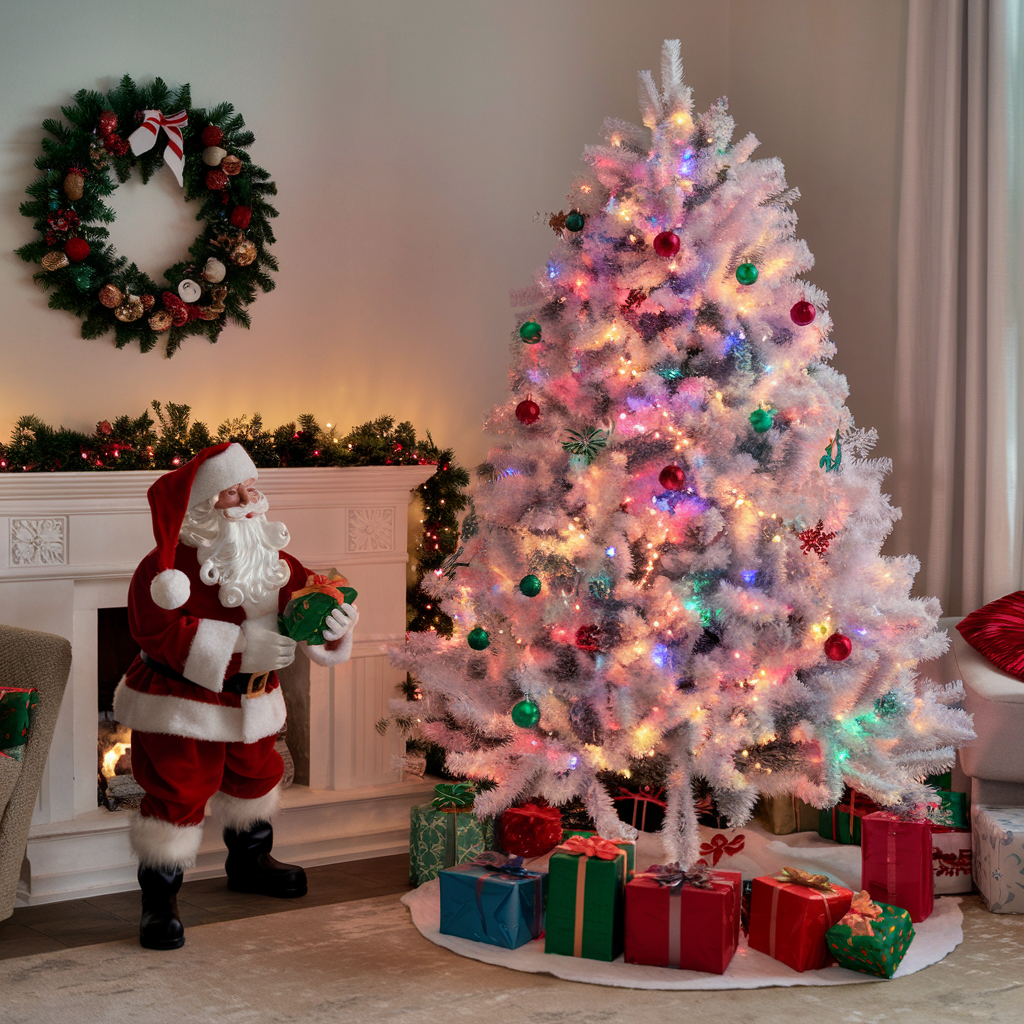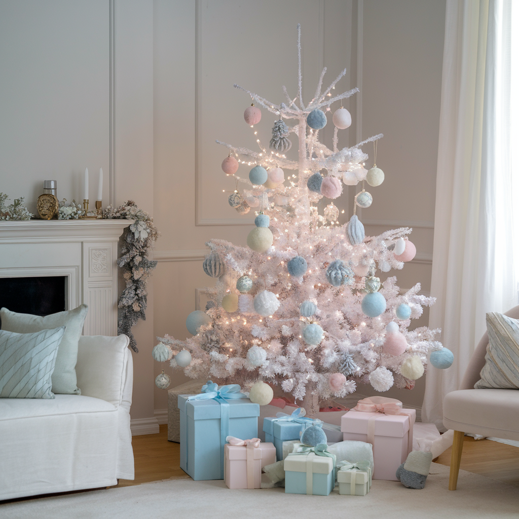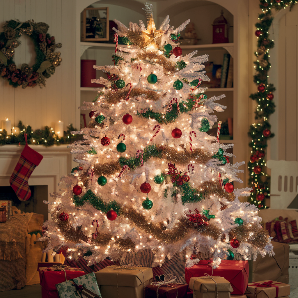 Soft white lights are a great choice for your white Christmas tree if you want to create a peaceful and calming atmosphere. This kind of lighting gives off a subtle beam that is just right for creating a restful holiday setting. Combine these lights with soft, plush ornaments in pastel colors such as light blue, pink, and cream to keep the calm atmosphere going.