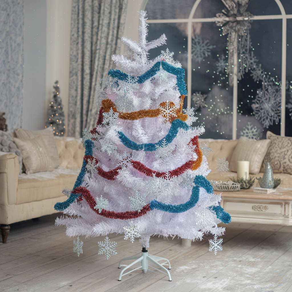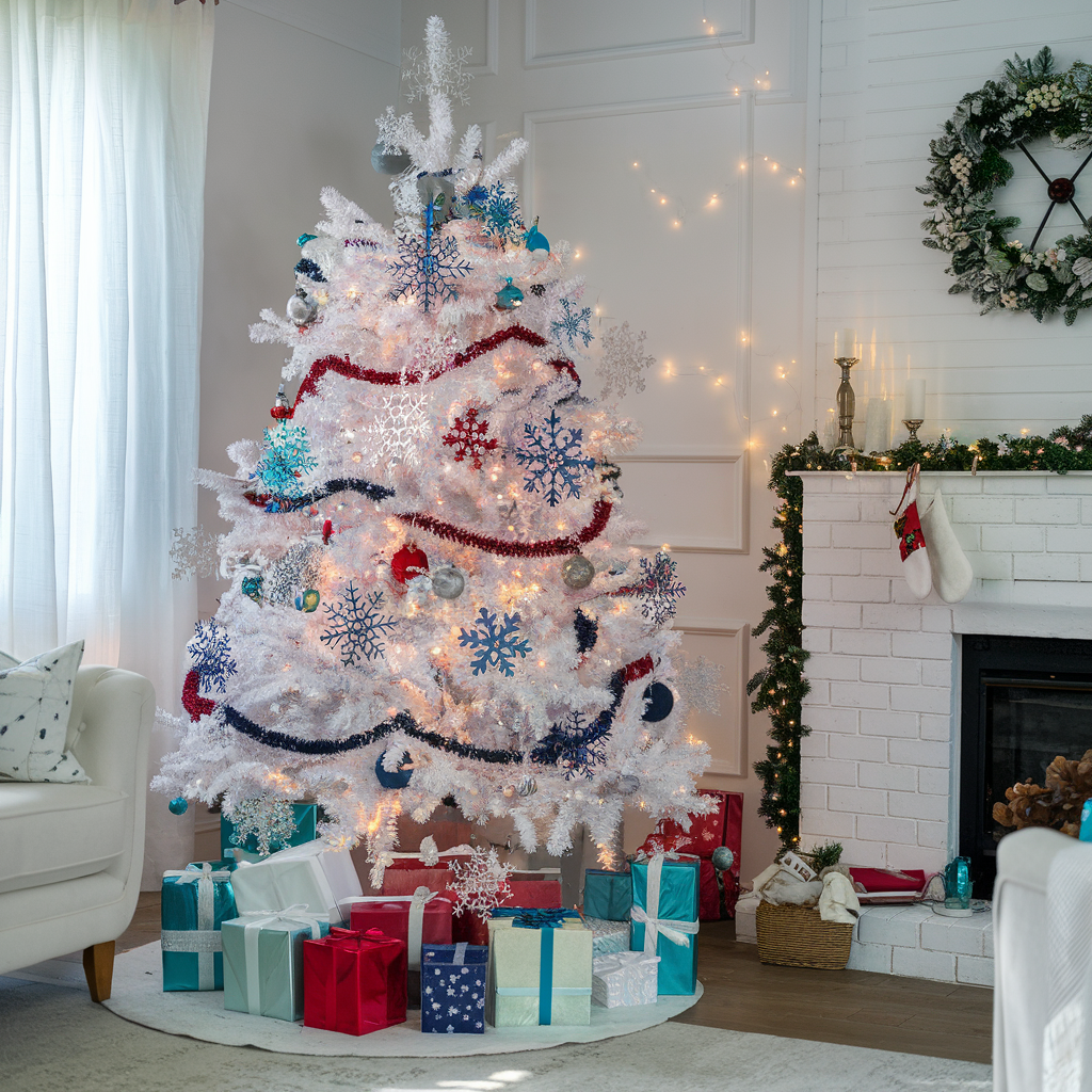 Swirling white lights can make your white Christmas tree a divine pillar of your interior space. At the same time, they offer the appearance of stars in the sky, which magically connotates the holiday season. Use them in conjunction with ever-white and silver Christmas ornaments so that the lights receive the spotlight. This model sets off an atmosphere of the whimsical and enchanted forests in your abode.
