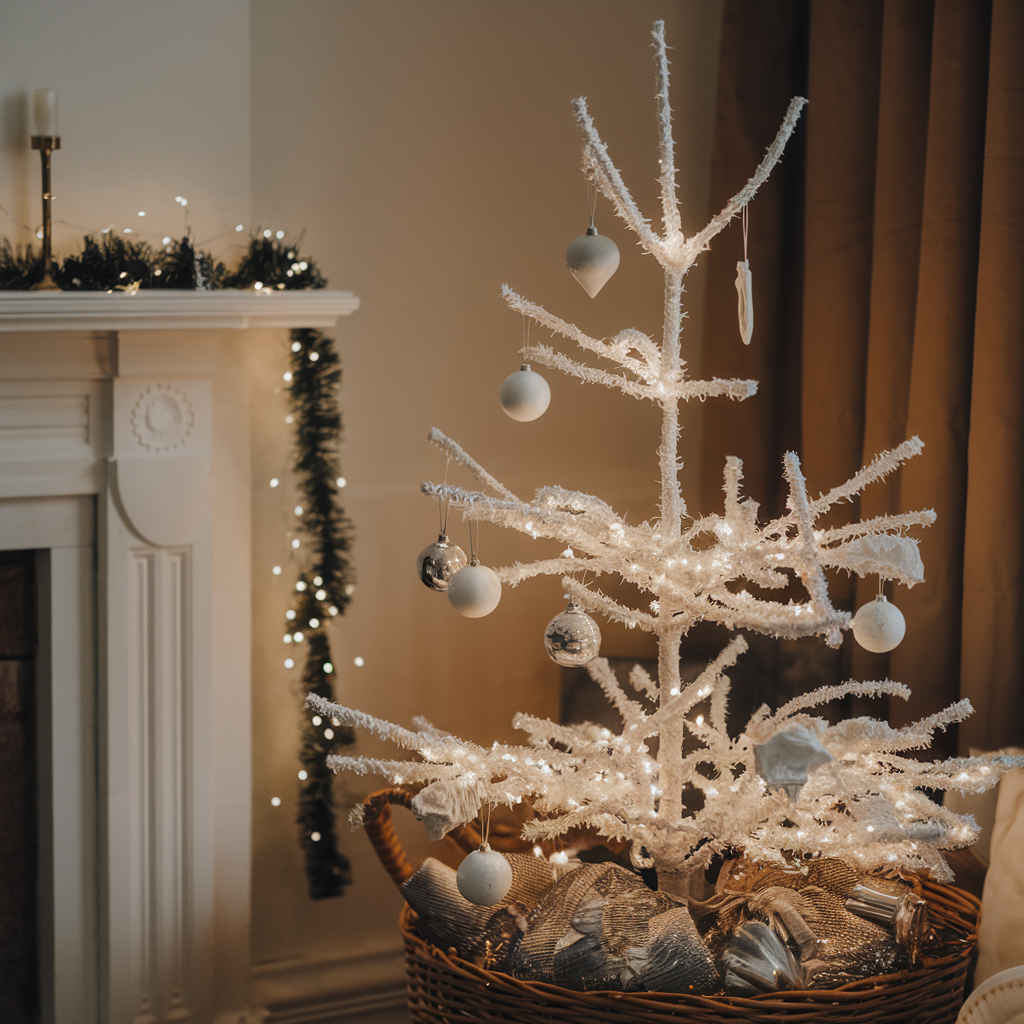 If you are looking for a festive touch of the past, you can choose a vintage-inspired white Christmas light tree. Warm white string lights will bring out the classic Christmas spirit, and the retro-style ornaments like glass baubles, tinsel, and antique figurines will do the trick. You may use vintage tree toppers or ribbon garlands to give your home an old-world feel. This design is perfect for those who enjoy vintage holiday decor’s warmth and personality.