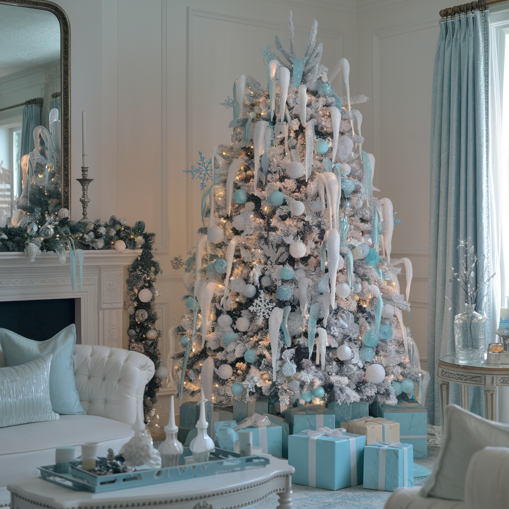 Icicle lights add a charming flair of classiness and wintry truism to the often white Christmas light trees. The twinkling lights are like the icy icicles, which hang from the branches emitting a frosted effect on the trees. Complement them with white and silver ornaments, snowflakes, and some light blue decorations to make the icy theme more striking. This is an interior design that brings the winter wonderland into the house, with a nice touch for a sophisticated holiday party.