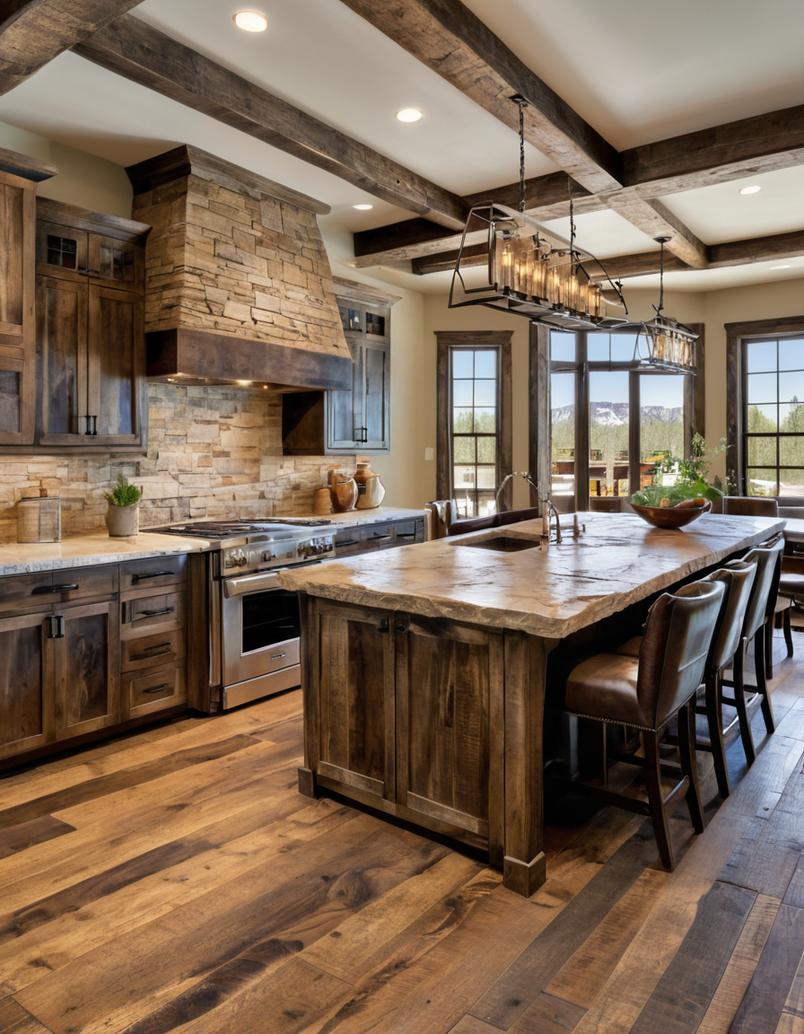 Rustic kitchen countertops made of natural stone bring the beauty of the outdoors into your home by adding granite, soapstone, or marble to wood cabinetations, with the rugged yet elegant surface. The combination of stone and wood in a rustic kitchen design creates a harmonious balance of textures, ideal for both modern and contemporary kitchens. Consider choosing stones with earthy tones, such as gray, beige, or green, to enhance the natural look and feel of the space.