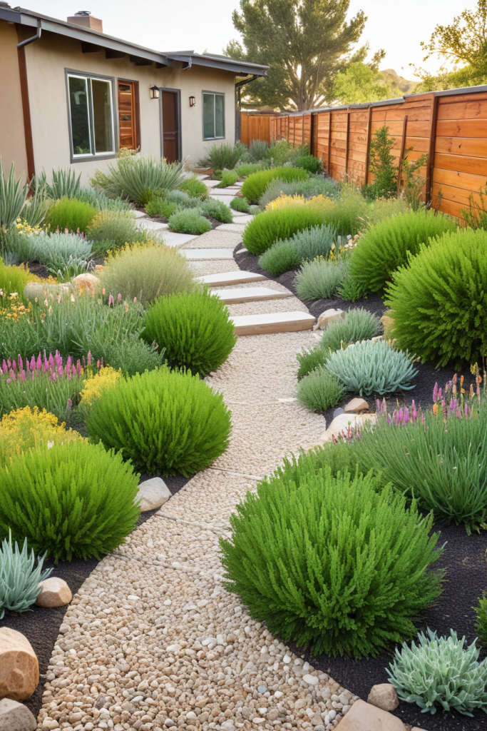 Low-maintenance yards don’t have to be dull. Opt for gravel pathways, drought-tolerant native plants, and raised garden beds with mulch to suppress weeds. Replace traditional grass with turf alternatives like clover or artificial grass. Use automatic irrigation systems and strategically placed large planters for minimal upkeep.