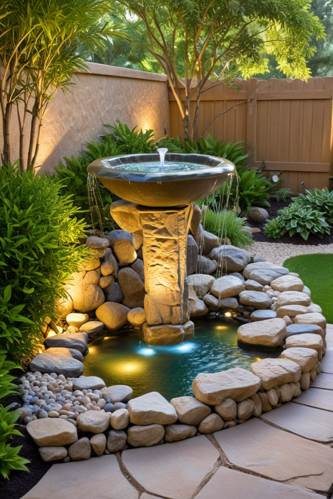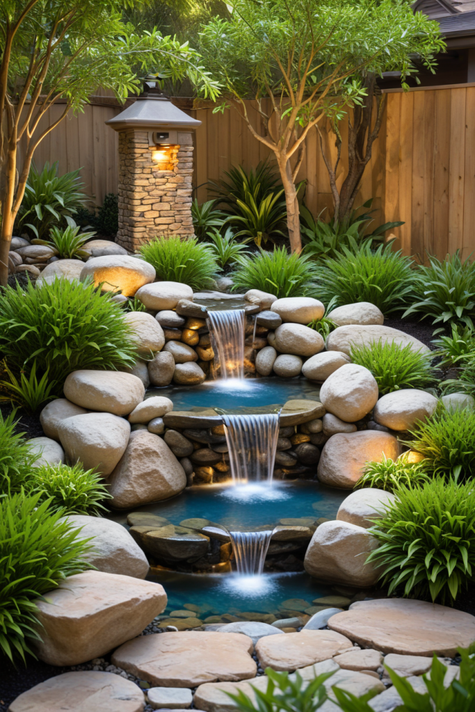 Water features can transform any yard into a peaceful retreat. A small pond, a bubbling fountain, or even a minimalist waterfall can add movement and soothing sounds. Surround these features with stones and lush greenery to create a natural look. Lighting can enhance the ambiance at night.
