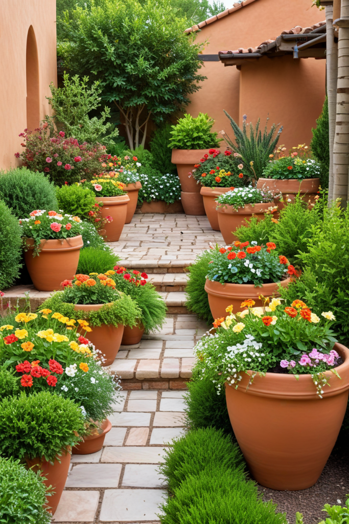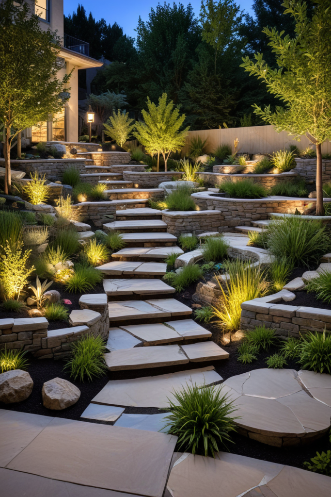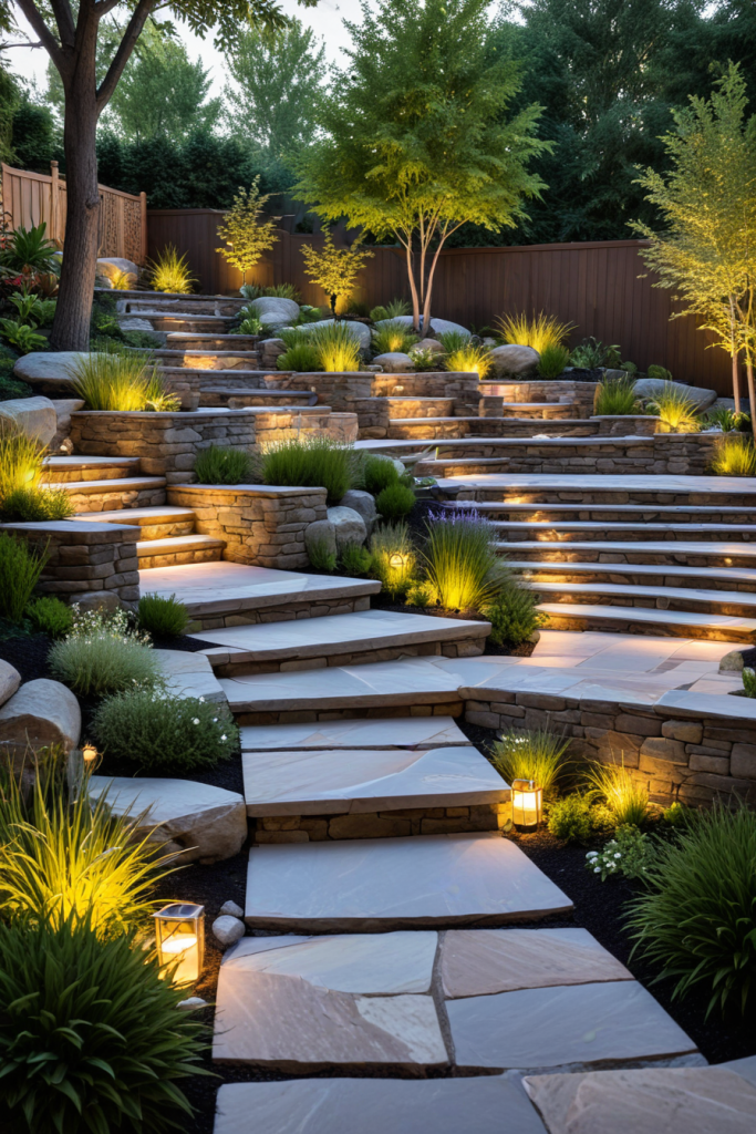 Terracing is an excellent solution for sloped yards, transforming challenging terrain into a beautiful and functional space. Create multiple levels using retaining walls made of stone, concrete, or wood. Each level can serve a unique purpose—planting gardens, creating seating areas, or adding a water feature. Incorporate stairs or pathways for easy access between levels, and use lighting to enhance the design.