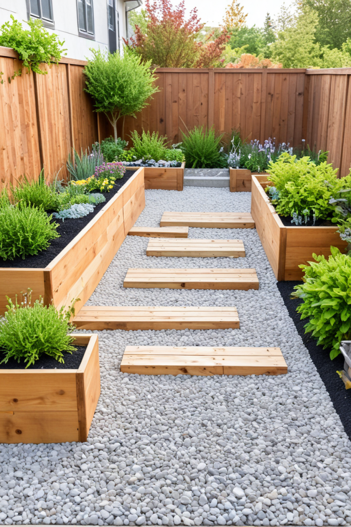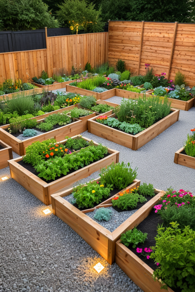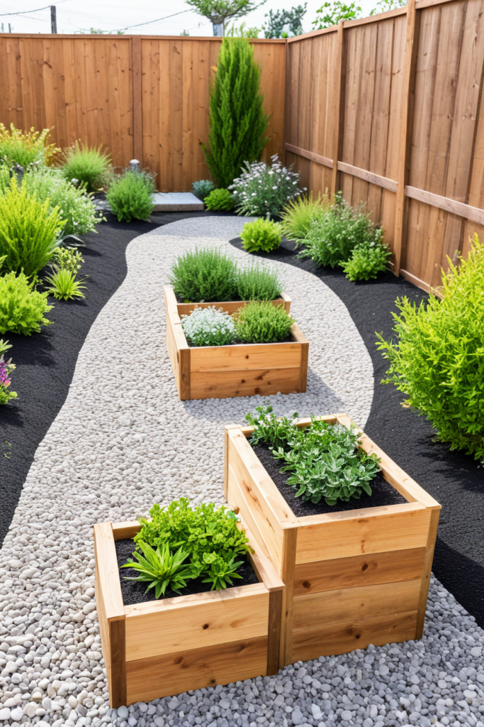 Raised garden beds add both functionality and charm to your yard. Use materials like cedar wood or galvanized metal to construct the beds, filling them with a mix of vegetables, herbs, or colorful flowers. Arrange the beds in geometric patterns for a modern look, and add gravel paths for accessibility and aesthetic appeal.