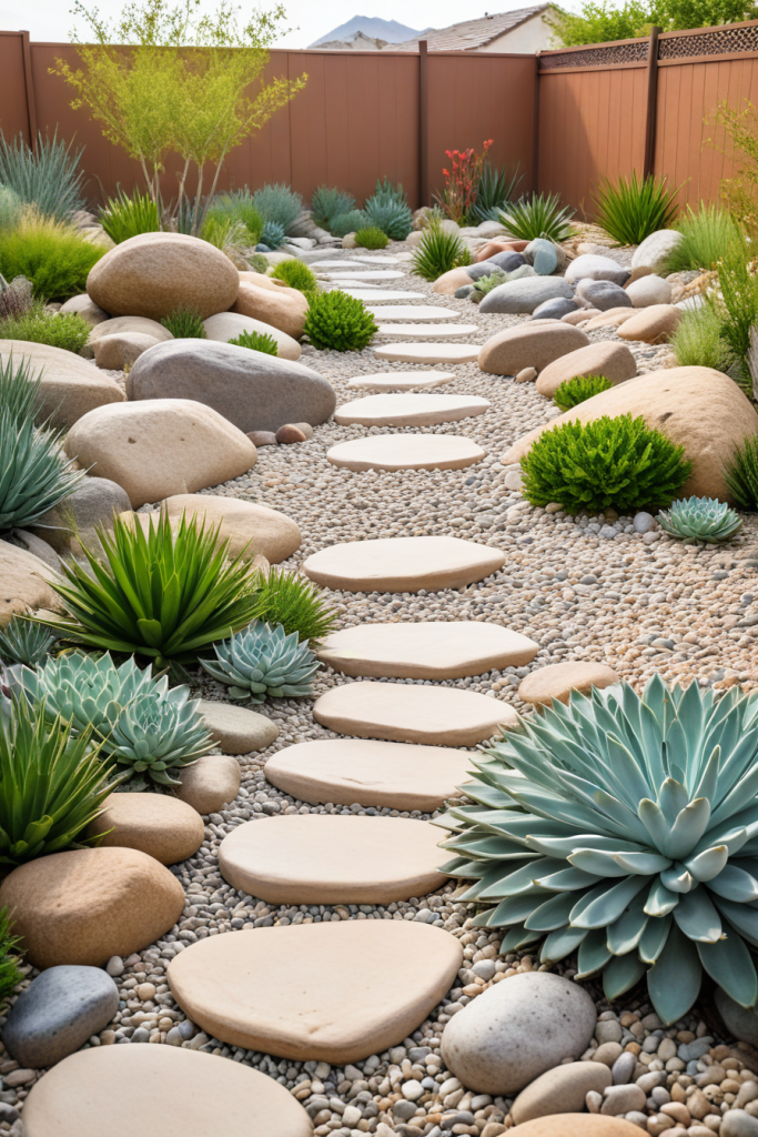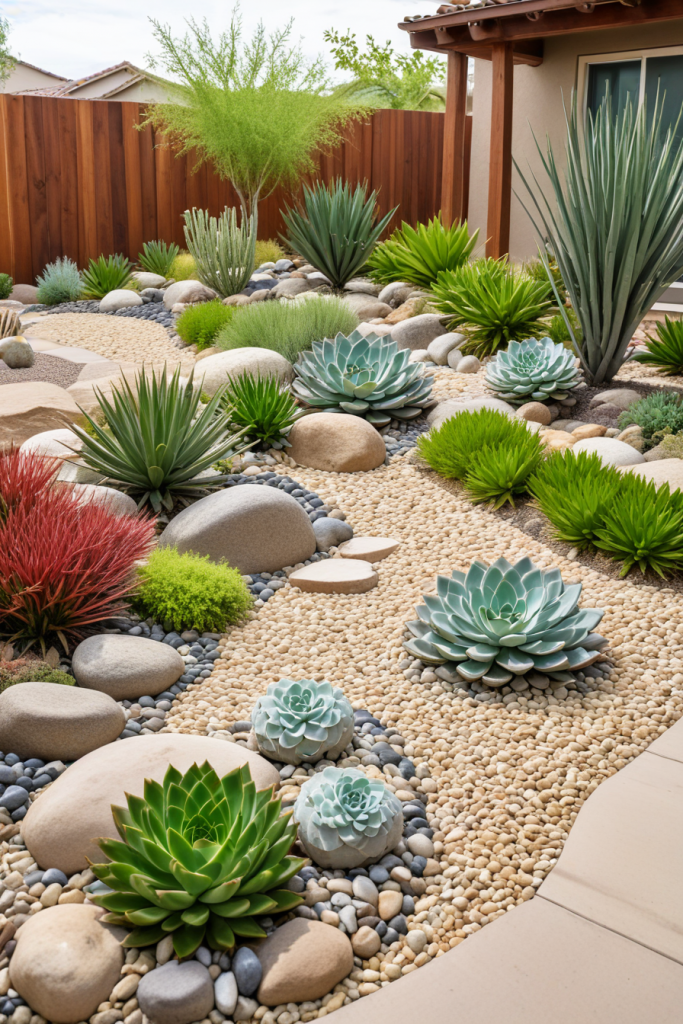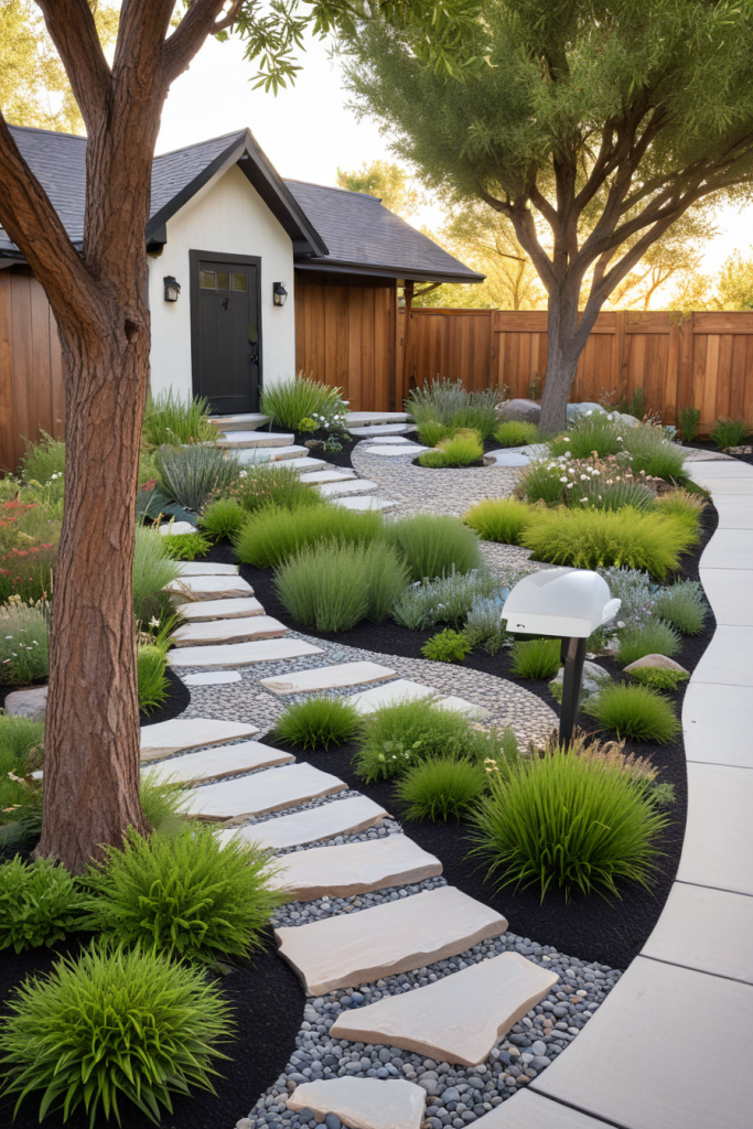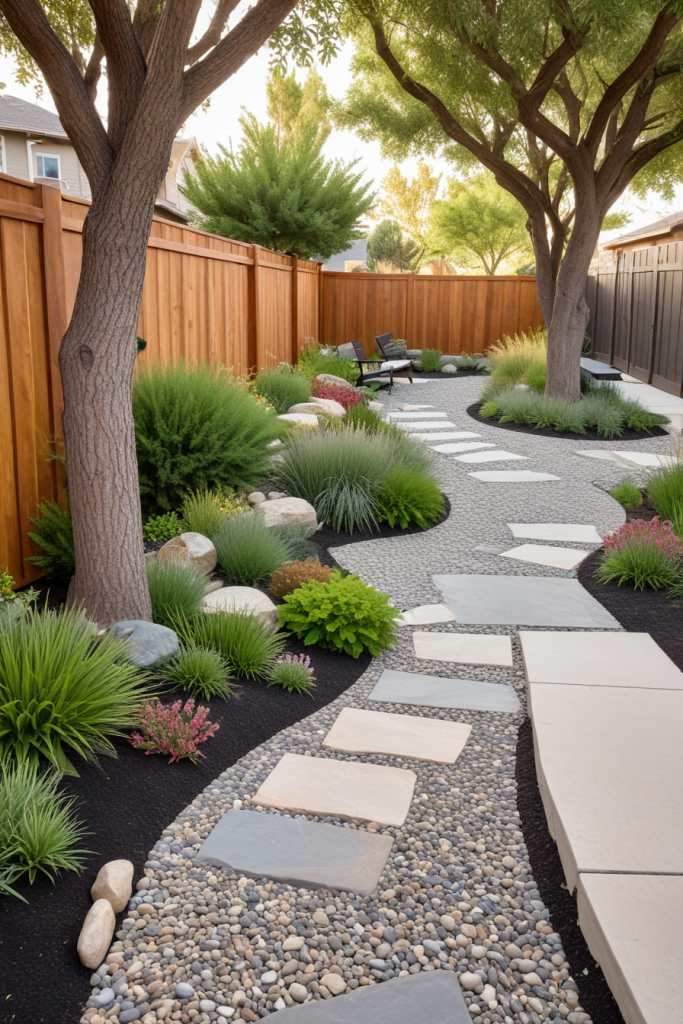 Rocks and gravel add depth and dimension to your yard while keeping maintenance low. Use gravel pathways, river rock edging, and large boulders to create focal points. Combine these elements with drought-tolerant plants like succulents or ornamental grasses for a cohesive and modern design.