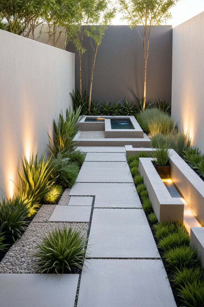 Modern minimalist landscaping focuses on clean lines, simplicity, and balance. Use sleek hardscapes like concrete or stone, paired with structured plants such as boxwoods or succulents. Incorporate geometric layouts, such as rectangular planters or linear pathways, and keep the palette neutral with a few accent colors for contrast. Minimalist lighting and water features can enhance the serene ambiance.